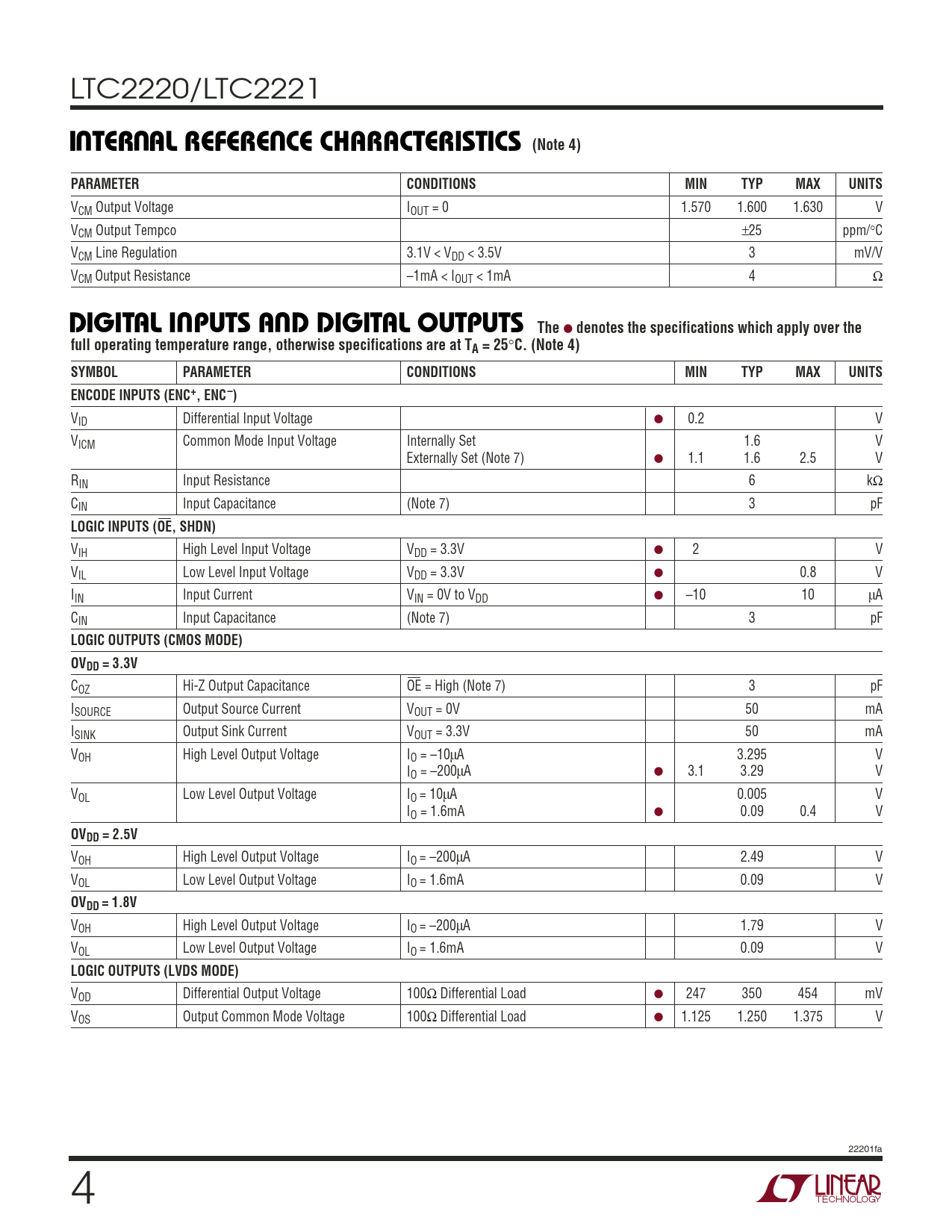 LTC2220/LTC2221 UUUI TER AL REFERE CE CHARACTERISTICS (Note 4)PARAMETERCONDITIONSMINTYPMAXUNITS VCM Output Voltage IOUT = 0 1.570 1.600 1.630 V VCM Output Tempco ±25 ppm/°C VCM Line Regulation 3.1V < VDD < 3.5V 3 mV/V VCM Output Resistance –1mA < IOUT < 1mA 4 Ω UUDIGITAL I PUTS A D DIGITAL OUTPUTS The ● denotes the specifications which apply over thefull operating temperature range, otherwise specifications are at TA = 25 ° C. (Note 4)SYMBOLPARAMETERCONDITIONSMINTYPMAXUNITSENCODE INPUTS (ENC+, ENC–) VID Differential Input Voltage ● 0.2 V VICM Common Mode Input Voltage Internally Set 1.6 V Externally Set (Note 7) ● 1.1 1.6 2.5 V RIN Input Resistance 6 kΩ CIN Input Capacitance (Note 7) 3 pF LOGIC INPUTS (OE, SHDN) VIH High Level Input Voltage VDD = 3.3V ● 2 V VIL Low Level Input Voltage VDD = 3.3V ● 0.8 V IIN Input Current VIN = 0V to VDD ● –10 10 µA CIN Input Capacitance (Note 7) 3 pF LOGIC OUTPUTS (CMOS MODE)OVDD = 3.3V COZ Hi-Z Output Capacitance OE = High (Note 7) 3 pF ISOURCE Output Source Current VOUT = 0V 50 mA ISINK Output Sink Current VOUT = 3.3V 50 mA VOH High Level Output Voltage IO = –10µA 3.295 V IO = –200µA ● 3.1 3.29 V VOL Low Level Output Voltage IO = 10µA 0.005 V IO = 1.6mA ● 0.09 0.4 V OVDD = 2.5V VOH High Level Output Voltage IO = –200µA 2.49 V VOL Low Level Output Voltage IO = 1.6mA 0.09 V OVDD = 1.8V VOH High Level Output Voltage IO = –200µA 1.79 V VOL Low Level Output Voltage IO = 1.6mA 0.09 V LOGIC OUTPUTS (LVDS MODE) VOD Differential Output Voltage 100Ω Differential Load ● 247 350 454 mV VOS Output Common Mode Voltage 100Ω Differential Load ● 1.125 1.250 1.375 V 22201fa 4