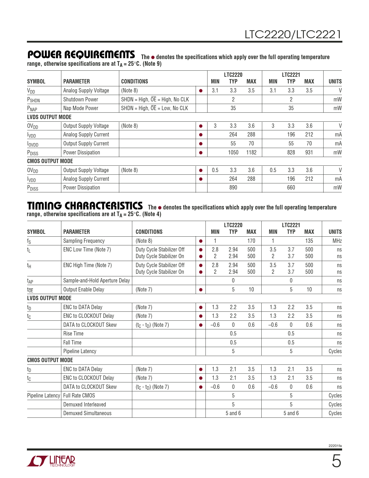 C. (Note 9) LTC2220 LTC2221 SYMBOL PARAMETER CONDITIONS MIN TYP MAX MIN TYP MAX UNITS
