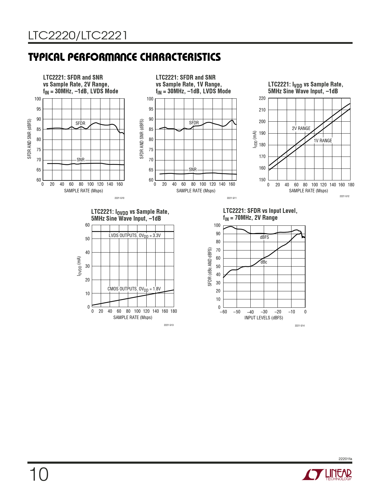 60 100 LVDS OUTPUTS, OV 90 DD = 3.3V 50 dBFS 80 70 40 60 dBc (mA) 30 50 I OVDD 40 20 SFDR (dBc AND dBFS) 30 CMOS OUTPUTS, OVDD = 1.8V 20 10 10 0 0 0 20 40 60 80 100 120 140 160 180 – 60 – 50 –40 –30 –20 –10 0 SAMPLE RATE (Msps) INPUT LEVELS (dBFS) 2221 G13 2221 G14 22201fa 10