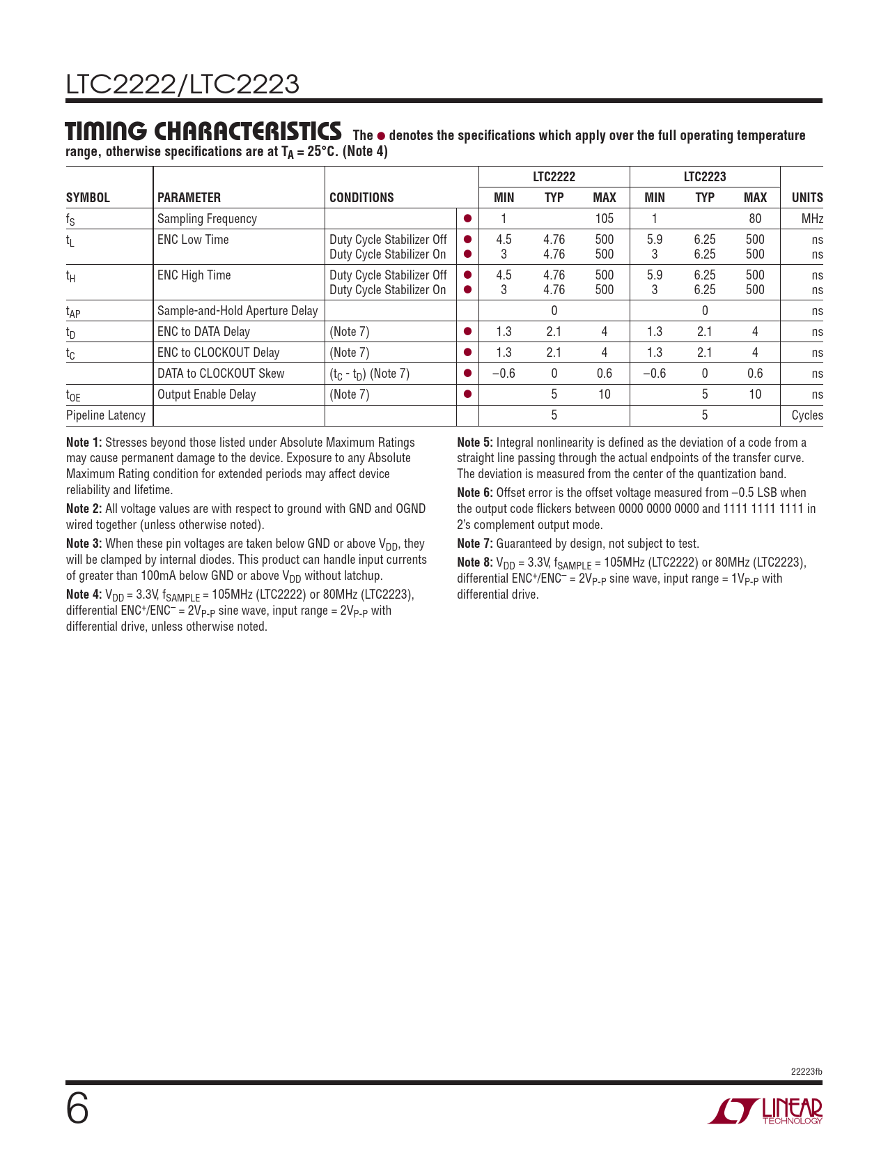 LTC2222/LTC2223 TIMING CHARACTERISTICSThe l denotes the specifi cations which apply over the full operating temperaturerange, otherwise specifi cations are at TA = 25°C. (Note 4)LTC2222LTC2223SYMBOLPARAMETERCONDITIONSMINTYPMAXMINTYPMAXUNITS fS Sampling Frequency l 1 105 1 80 MHz tL ENC Low Time Duty Cycle Stabilizer Off l 4.5 4.76 500 5.9 6.25 500 ns Duty Cycle Stabilizer On l 3 4.76 500 3 6.25 500 ns tH ENC High Time Duty Cycle Stabilizer Off l 4.5 4.76 500 5.9 6.25 500 ns Duty Cycle Stabilizer On l 3 4.76 500 3 6.25 500 ns tAP Sample-and-Hold Aperture Delay 0 0 ns tD ENC to DATA Delay (Note 7) l 1.3 2.1 4 1.3 2.1 4 ns tC ENC to CLOCKOUT Delay (Note 7) l 1.3 2.1 4 1.3 2.1 4 ns DATA to CLOCKOUT Skew (tC - tD) (Note 7) l –0.6 0 0.6 –0.6 0 0.6 ns tOE Output Enable Delay (Note 7) l 5 10 5 10 ns Pipeline Latency 5 5 Cycles Note 1: Stresses beyond those listed under Absolute Maximum Ratings Note 5: Integral nonlinearity is defi ned as the deviation of a code from a may cause permanent damage to the device. Exposure to any Absolute straight line passing through the actual endpoints of the transfer curve. Maximum Rating condition for extended periods may affect device The deviation is measured from the center of the quantization band. reliability and lifetime. Note 6: Offset error is the offset voltage measured from –0.5 LSB when Note 2: All voltage values are with respect to ground with GND and OGND the output code fl ickers between 0000 0000 0000 and 1111 1111 1111 in wired together (unless otherwise noted). 2’s complement output mode. Note 3: When these pin voltages are taken below GND or above VDD, they Note 7: Guaranteed by design, not subject to test. will be clamped by internal diodes. This product can handle input currents Note 8: VDD = 3.3V, fSAMPLE = 105MHz (LTC2222) or 80MHz (LTC2223), of greater than 100mA below GND or above VDD without latchup. differential ENC+/ENC– = 2VP-P sine wave, input range = 1VP-P with Note 4: VDD = 3.3V, fSAMPLE = 105MHz (LTC2222) or 80MHz (LTC2223), differential drive. differential ENC+/ENC– = 2VP-P sine wave, input range = 2VP-P with differential drive, unless otherwise noted. 22223fb 6