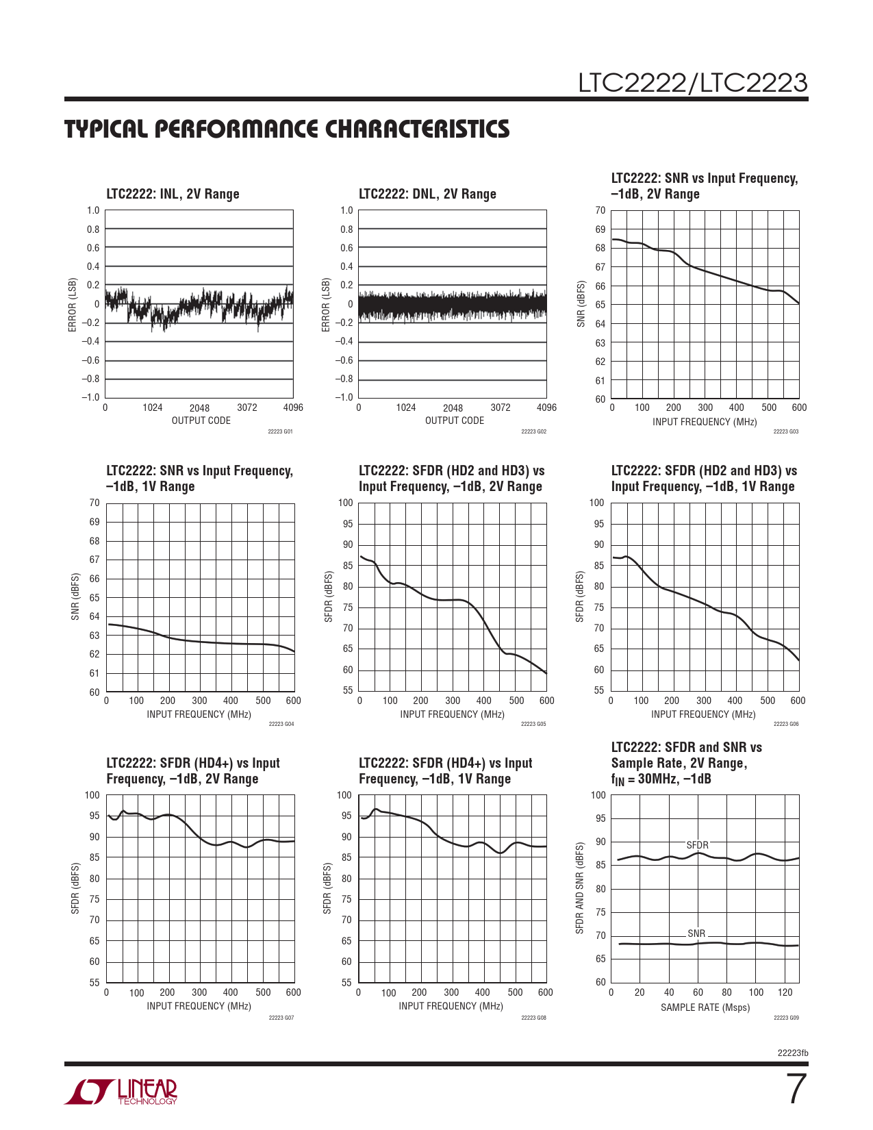 TYPICAL PERFORMANCE CHARACTERISTICS. LTC2222: SNR vs Input Frequency,. LTC2222: INL, 2V Range. LTC2222: DNL, 2V Range