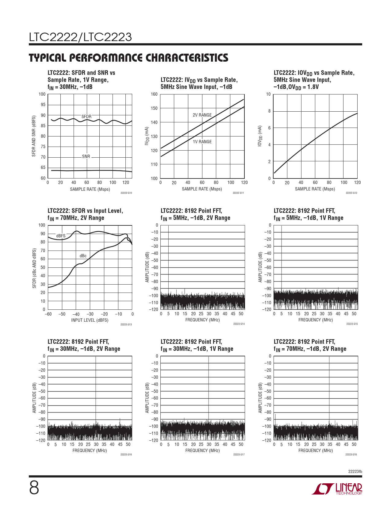 | Pages / Page | 28 / 8 — TYPICAL PERFORMANCE CHARACTERISTICS. LTC2222: SFDR and SNR vs. LTC2222: … |