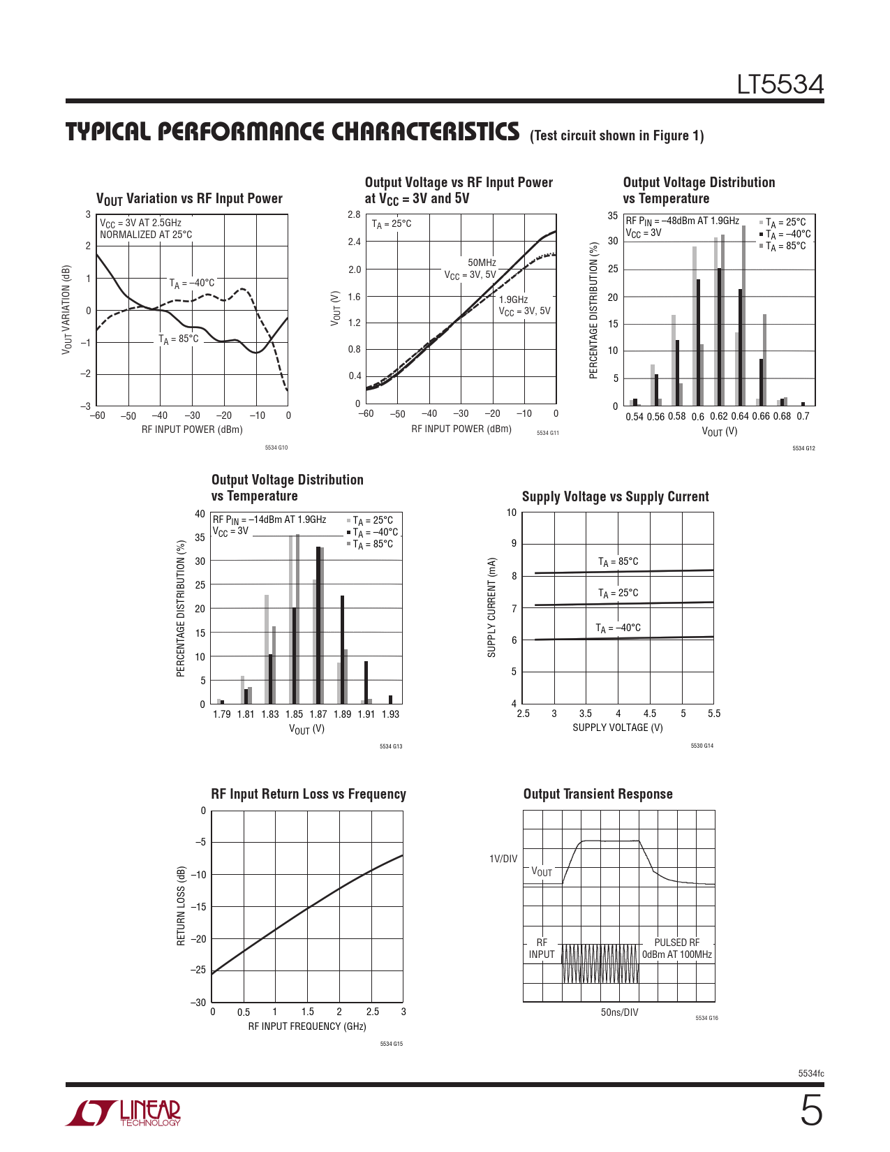 3 2.8 35 VCC = 3V AT 2.5GHz TA = 25°C RF PIN = –48dBm AT 1.9GHz TA = 25°C NORMALIZED AT 25°C VCC = 3V TA = –40°C 2 2.4 30 TA = 85°C 50MHz 2.0 25 1 V T CC = 3V, 5V A = –40°C 1.6 (V) 1.9GHz 20 0 VCC = 3V, 5V V OUT 1.2 VARIATION (dB) 15 –1 TA = 85°C V OUT 0.8 10 –2 0.4 PERCENTAGE DISTRIBUTION (%) 5 –3 0 0 –60 –50 –40 –30 –20 –10 0 –60 –50 –40 –30 –20 –10 0 0.54 0.56 0.58 0.6 0.62 0.64 0.66 0.68 0.7 RF INPUT POWER (dBm) RF INPUT POWER (dBm) 5534 G11 VOUT (V) 5534 G10 5534 G12