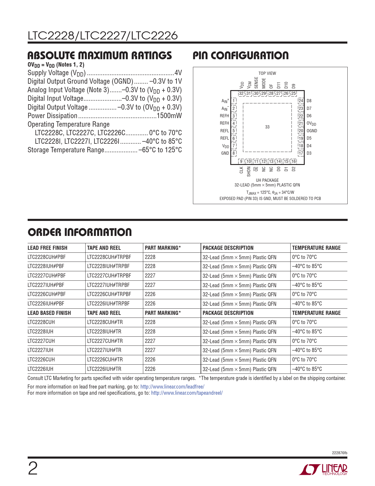 LTC2228/LTC2227/LTC2226 ABSOLUTE MAXIMUM RATINGSPIN CONFIGURATIONOVDD = VDD (Notes 1, 2) Supply Voltage (VDD) ..4V TOP VIEW Digital Output Ground Voltage (OGND) .. –0.3V to 1V DD CM Analog Input Voltage (Note 3) ...–0.3V to (V V V SENSE MODE OF D11 D10 D9 DD + 0.3V) 32 31 30 29 28 27 26 25 Digital Input Voltage ..–0.3V to (VDD + 0.3V) A + 1 24 IN D8 Digital Output Voltage .. –0.3V to (OVDD + 0.3V) A – 2 23 IN D7 Power Dissipation ...1500mW REFH 3 22 D6 Operating Temperature Range REFH 4 21 OVDD 33 LTC2228C, LTC2227C, LTC2226C... 0°C to 70°C REFL 5 20 OGND LTC2228I, LTC2227I, LTC2226I .. –40°C to 85°C REFL 6 19 D5 V 7 18 D4 Storage Temperature Range ... –65°C to 125°C DD GND 8 17 D3 9 10 11 12 13 14 15 16 OE CLK NC NC D0 D1 D2 SHDN UH PACKAGE 32-LEAD (5mm s 5mm) PLASTIC QFN TJMAX = 125°C, θJA = 34°C/W EXPOSED PAD (PIN 33) IS GND, MUST BE SOLDERED TO PCB ORDER INFORMATIONLEAD FREE FINISHTAPE AND REELPART MARKING*PACKAGE DESCRIPTIONTEMPERATURE RANGE LTC2228CUH#PBF LTC2228CUH#TRPBF 2228 32-Lead (5mm × 5mm) Plastic QFN 0°C to 70°C LTC2228IUH#PBF LTC2228IUH#TRPBF 2228 32-Lead (5mm × 5mm) Plastic QFN –40°C to 85°C LTC2227CUH#PBF LTC2227CUH#TRPBF 2227 32-Lead (5mm × 5mm) Plastic QFN 0°C to 70°C LTC2227IUH#PBF LTC2227IUH#TRPBF 2227 32-Lead (5mm × 5mm) Plastic QFN –40°C to 85°C LTC2226CUH#PBF LTC2226CUH#TRPBF 2226 32-Lead (5mm × 5mm) Plastic QFN 0°C to 70°C LTC2226IUH#PBF LTC2226IUH#TRPBF 2226 32-Lead (5mm × 5mm) Plastic QFN –40°C to 85°C LEAD BASED FINISHTAPE AND REELPART MARKING*PACKAGE DESCRIPTIONTEMPERATURE RANGE LTC2228CUH LTC2228CUH#TR 2228 32-Lead (5mm × 5mm) Plastic QFN 0°C to 70°C LTC2228IUH LTC2228IUH#TR 2228 32-Lead (5mm × 5mm) Plastic QFN –40°C to 85°C LTC2227CUH LTC2227CUH#TR 2227 32-Lead (5mm × 5mm) Plastic QFN 0°C to 70°C LTC2227IUH LTC2227IUH#TR 2227 32-Lead (5mm × 5mm) Plastic QFN –40°C to 85°C LTC2226CUH LTC2226CUH#TR 2226 32-Lead (5mm × 5mm) Plastic QFN 0°C to 70°C LTC2226IUH LTC2226IUH#TR 2226 32-Lead (5mm × 5mm) Plastic QFN –40°C to 85°C Consult LTC Marketing for parts specifi ed with wider operating temperature ranges. *The temperature grade is identifi ed by a label on the shipping container. For more information on lead free part marking, go to: http://www.linear.com/leadfree/ For more information on tape and reel specifi cations, go to: http://www.linear.com/tapeandreel/ 222876fb 2