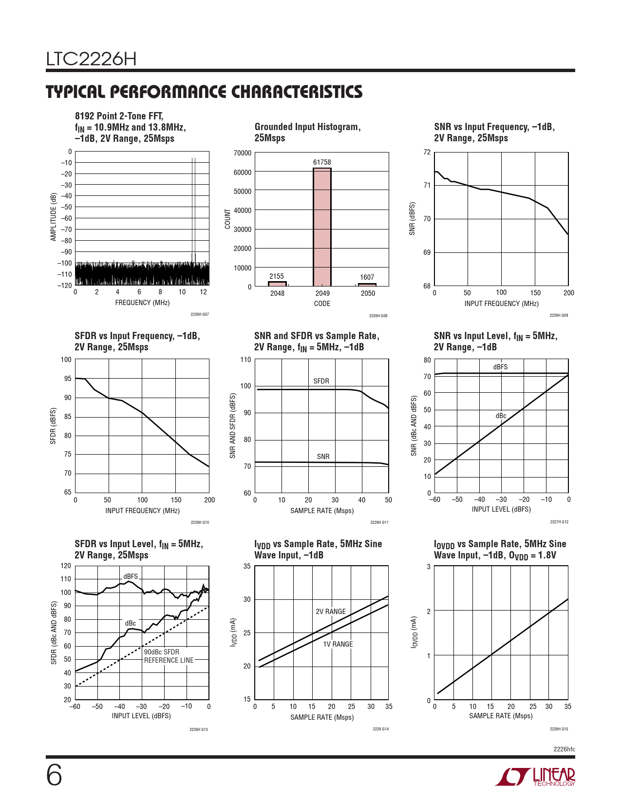 120 35 3 110 dBFS 100 30 90 2V RANGE 2 80 dBc 70 (mA) 25 (mA) 60 I VDD 1V RANGE I OVDD 90dBc SFDR 1 SFDR (dBc AND dBFS) 50 REFERENCE LINE 20 40 30 20 15 0 –60 –50 –40 –30 –20 –10 0 0 5 10 15 20 25 30 35 0 5 10 15 20 25 30 35 INPUT LEVEL (dBFS) SAMPLE RATE (Msps) SAMPLE RATE (Msps) 2226H G13 2226 G14 2226H G15 2226hfc 6
