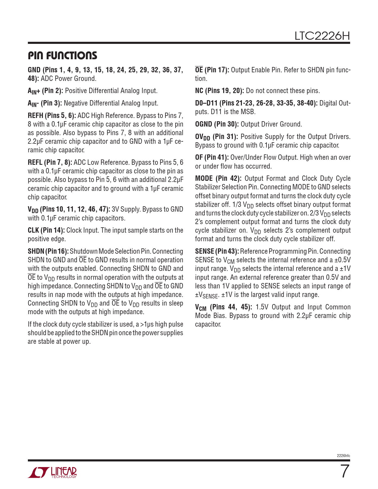 LTC2226H PIN FUNCTIONS GND (Pins 1, 4, 9, 13, 15, 18, 24, 25, 29, 32, 36, 37,OE (Pin 17): Output Enable Pin. Refer to SHDN pin func- 48): ADC Power Ground. tion. AIN+ (Pin 2): Positive Differential Analog Input. NC (Pins 19, 20): Do not connect these pins. AIN- (Pin 3): Negative Differential Analog Input. D0–D11 (Pins 21-23, 26-28, 33-35, 38-40): Digital Out- REFH (Pins 5, 6): ADC High Reference. Bypass to Pins 7, puts. D11 is the MSB. 8 with a 0.1µF ceramic chip capacitor as close to the pin OGND (Pin 30): Output Driver Ground. as possible. Also bypass to Pins 7, 8 with an additional OV 2.2µF ceramic chip capacitor and to GND with a 1µF ce- DD (Pin 31): Positive Supply for the Output Drivers. Bypass to ground with 0.1µF ceramic chip capacitor. ramic chip capacitor. OF (Pin 41): Over/Under Flow Output. High when an over REFL (Pin 7, 8): ADC Low Reference. Bypass to Pins 5, 6 or under flow has occurred. with a 0.1µF ceramic chip capacitor as close to the pin as possible. Also bypass to Pin 5, 6 with an additional 2.2µF MODE (Pin 42): Output Format and Clock Duty Cycle ceramic chip capacitor and to ground with a 1µF ceramic Stabilizer Selection Pin. Connecting MODE to GND selects chip capacitor. offset binary output format and turns the clock duty cycle stabilizer off. 1/3 V V DD selects offset binary output format DD (Pins 10, 11, 12, 46, 47): 3V Supply. Bypass to GND and turns the clock duty cycle stabilizer on. 2/3 V with 0.1µF ceramic chip capacitors. DD selects 2’s complement output format and turns the clock duty CLK (Pin 14): Clock Input. The input sample starts on the cycle stabilizer on. VDD selects 2’s complement output positive edge. format and turns the clock duty cycle stabilizer off. SHDN (Pin 16): Shutdown Mode Selection Pin. Connecting SENSE (Pin 43): Reference Programming Pin. Connecting SHDN to GND and OE to GND results in normal operation SENSE to VCM selects the internal reference and a ±0.5V with the outputs enabled. Connecting SHDN to GND and input range. VDD selects the internal reference and a ±1V OE to VDD results in normal operation with the outputs at input range. An external reference greater than 0.5V and high impedance. Connecting SHDN to VDD and OE to GND less than 1V applied to SENSE selects an input range of results in nap mode with the outputs at high impedance. ±VSENSE. ±1V is the largest valid input range. Connecting SHDN to VDD and OE to VDD results in sleep V mode with the outputs at high impedance. CM (Pins 44, 45): 1.5V Output and Input Common Mode Bias. Bypass to ground with 2.2µF ceramic chip If the clock duty cycle stabilizer is used, a >1µs high pulse capacitor. should be applied to the SHDN pin once the power supplies are stable at power up. 2226hfc 7