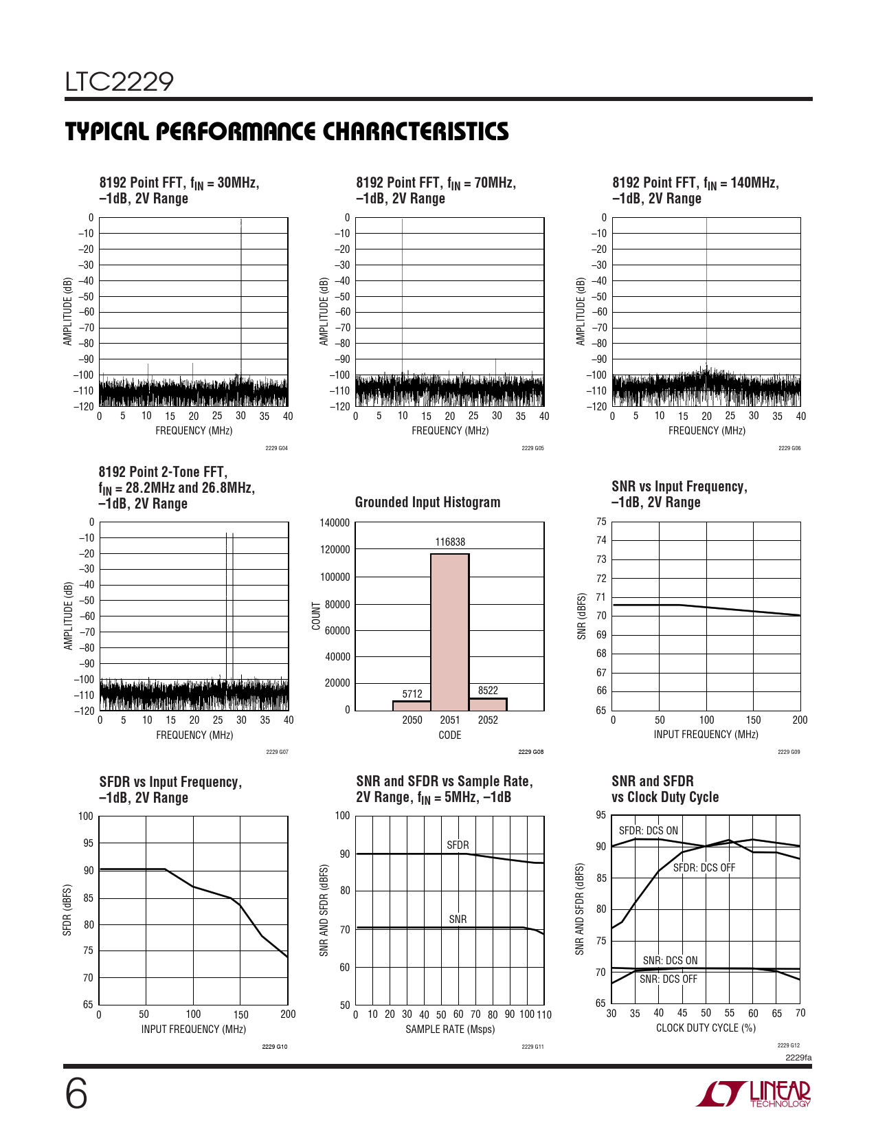 100 100 95 SFDR: DCS ON 95 SFDR 90 90 90 SFDR: DCS OFF 85 80 85 80 SNR 80 SFDR (dBFS) 70 75 75 SNR AND SFDR (dBFS) SNR AND SFDR (dBFS) SNR: DCS ON 60 70 70 SNR: DCS OFF 65 50 65 0 50 100 150 200 0 10 20 30 40 50 60 70 80 90 100 110 30 35 40 45 50 55 60 65 70 INPUT FREQUENCY (MHz) SAMPLE RATE (Msps) CLOCK DUTY CYCLE (%) 2229 G10 2229 G11 2229 G12 2229fa 6