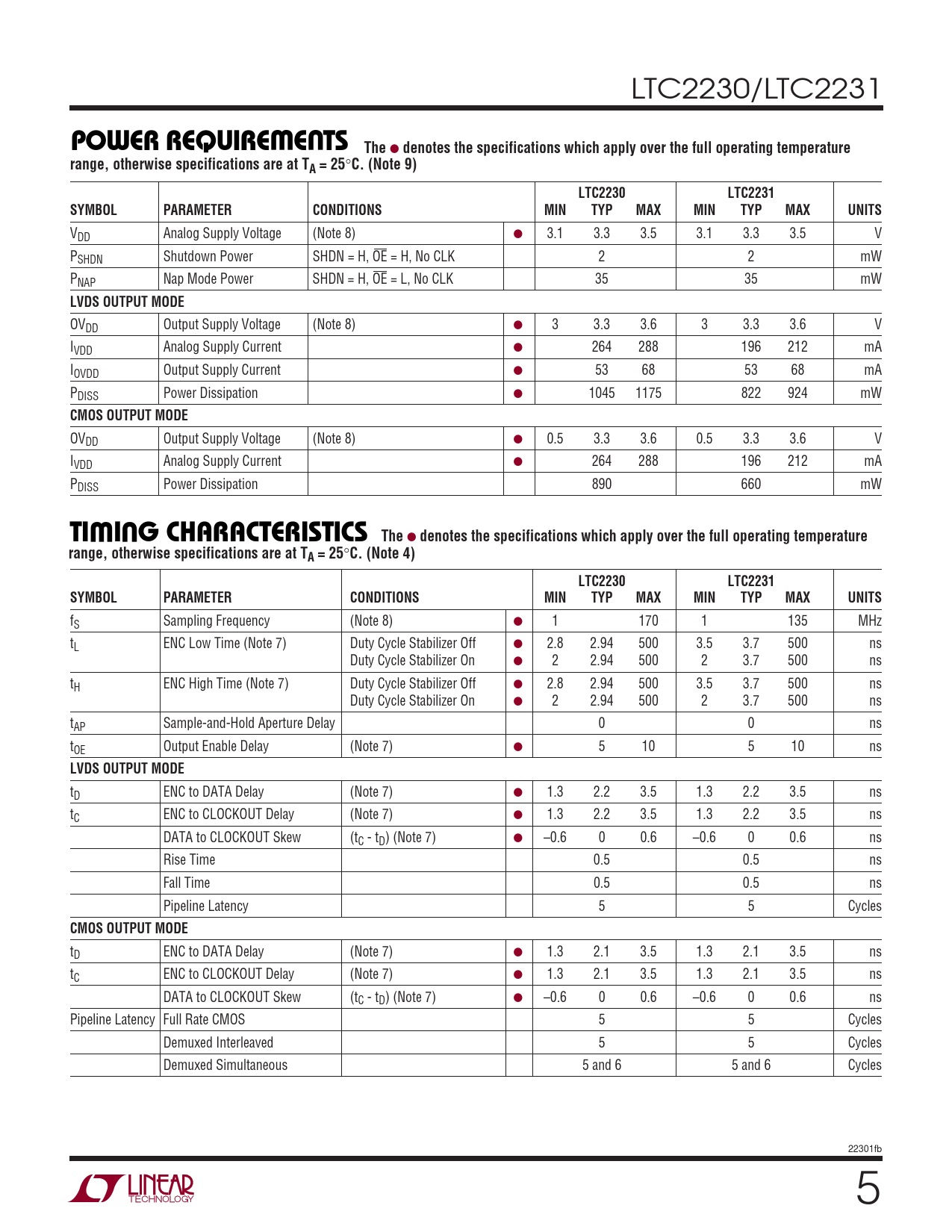 C. (Note 9) LTC2230 LTC2231 SYMBOL PARAMETER CONDITIONS MIN TYP MAX MIN TYP MAX UNITS