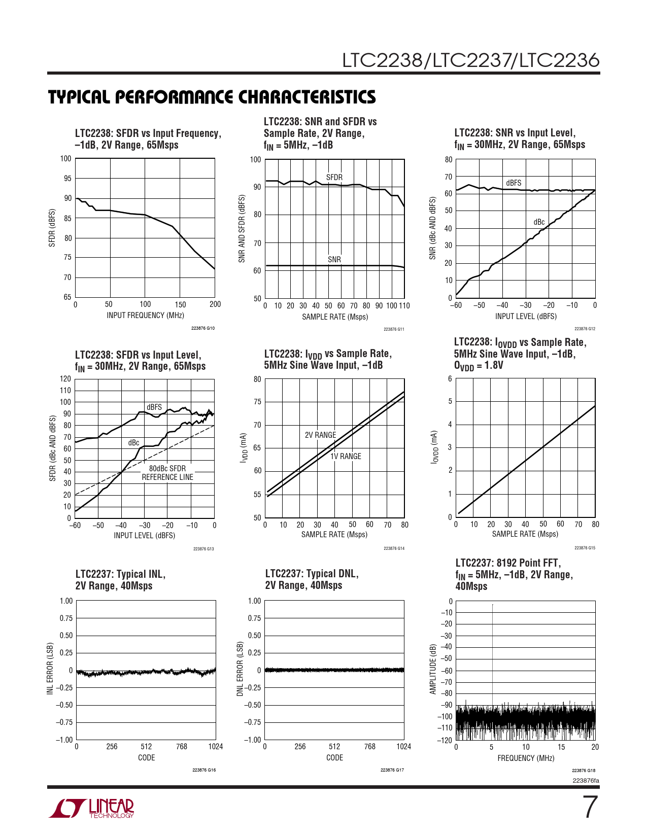 | Pages / Page | 28 / 7 — TYPICAL PERFOR A CE CHARACTERISTICS. LTC2238: SNR and SFDR vs. LTC2238: … |