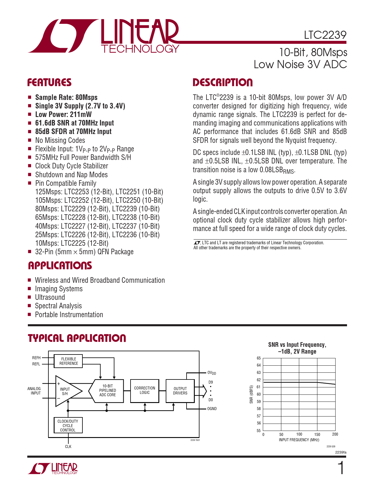 LTC2239 10-Bit, 80Msps Low Noise 3V ADC UFEATURESDESCRIPTIO ■ Sample Rate: 80Msps The LTC®2239 is a 10-bit 80Msps, low power 3V A/D ■ Single 3V Supply (2.7V to 3.4V) converter designed for digitizing high frequency, wide ■ Low Power: 211mW dynamic range signals. The LTC2239 is perfect for de- ■ 61.6dB SNR at 70MHz Input manding imaging and communications applications with ■ 85dB SFDR at 70MHz Input AC performance that includes 61.6dB SNR and 85dB ■ No Missing Codes SFDR for signals well beyond the Nyquist frequency. ■ Flexible Input: 1VP-P to 2VP-P Range DC specs include ±0.1LSB INL (typ), ±0.1LSB DNL (typ) ■ 575MHz Full Power Bandwidth S/H and ±0.5LSB INL, ±0.5LSB DNL over temperature. The ■ Clock Duty Cycle Stabilizer transition noise is a low 0.08LSB ■ Shutdown and Nap Modes RMS. ■ Pin Compatible Family A single 3V supply allows low power operation. A separate 125Msps: LTC2253 (12-Bit), LTC2251 (10-Bit) output supply allows the outputs to drive 0.5V to 3.6V 105Msps: LTC2252 (12-Bit), LTC2250 (10-Bit) logic. 80Msps: LTC2229 (12-Bit), LTC2239 (10-Bit) A single-ended CLK input controls converter operation. An 65Msps: LTC2228 (12-Bit), LTC2238 (10-Bit) optional clock duty cycle stabilizer allows high perfor- 40Msps: LTC2227 (12-Bit), LTC2237 (10-Bit) mance at full speed for a wide range of clock duty cycles. 25Msps: LTC2226 (12-Bit), LTC2236 (10-Bit) 10Msps: LTC2225 (12-Bit) , LTC and LT are registered trademarks of Linear Technology Corporation. All other trademarks are the property of their respective owners. ■ 32-Pin (5mm × 5mm) QFN Package UAPPLICATIO S ■ Wireless and Wired Broadband Communication ■ Imaging Systems ■ Ultrasound ■ Spectral Analysis ■ Portable Instrumentation UTYPICAL APPLICATIOSNR vs Input Frequency,–1dB, 2V Range REFH FLEXIBLE 65 REFL REFERENCE 64 OVDD 63 62 + D9 10-BIT • ANALOG 61 INPUT CORRECTION OUTPUT PIPELINED • INPUT S/H LOGIC DRIVERS ADC CORE • 60 – D0 SNR (dBFS) 59 OGND 58 57 CLOCK/DUTY 56 CYCLE CONTROL 55 0 50 100 150 200 2239 TA01 INPUT FREQUENCY (MHz) CLK 2239 G09 2239fa 1