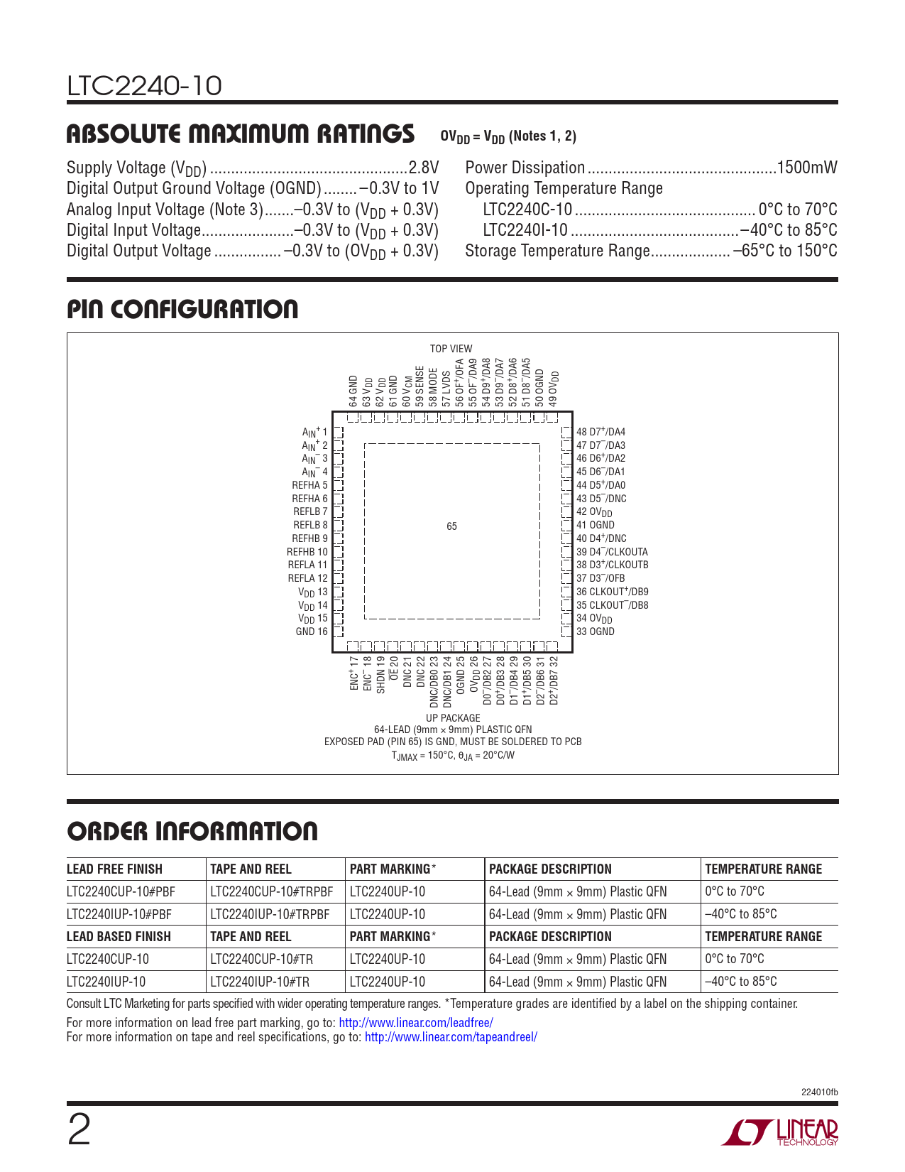 LTC2240CUP-10 LTC2240CUP-10#TR LTC2240UP-10 64-Lead (9mm × 9mm) Plastic QFN 0°C to 70°C LTC2240IUP-10 LTC2240IUP-10#TR LTC2240UP-10 64-Lead (9mm × 9mm) Plastic QFN –40°C to 85°C Consult LTC Marketing for parts specifi ed with wider operating temperature ranges. *Temperature grades are identifi ed by a label on the shipping container. For more information on lead free part marking, go to: http://www.linear.com/leadfree/ For more information on tape and reel specifi cations, go to: http://www.linear.com/tapeandreel/ 224010fb 2