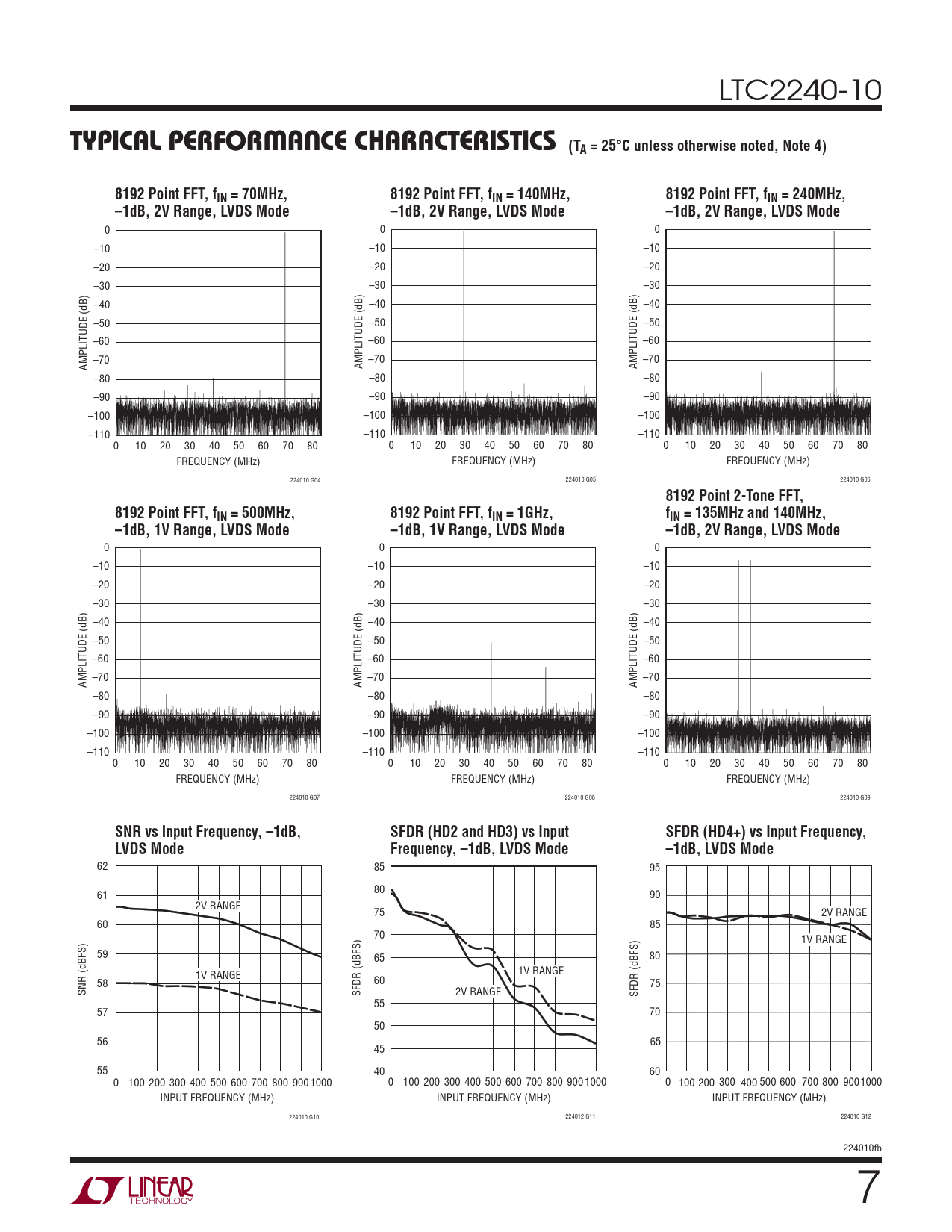 TYPICAL PERFORMANCE CHARACTERISTICS (TA = 25°C unless otherwise noted, Note 4) 8192 Point FFT, fIN = 70MHz, 8192 Point FFT, fIN = 140MHz, 8192 Point FFT, fIN = 240MHz, –1dB, 2V Range, LVDS Mode –1dB, 2V Range, LVDS Mode –1dB, 2V Range, LVDS Mode