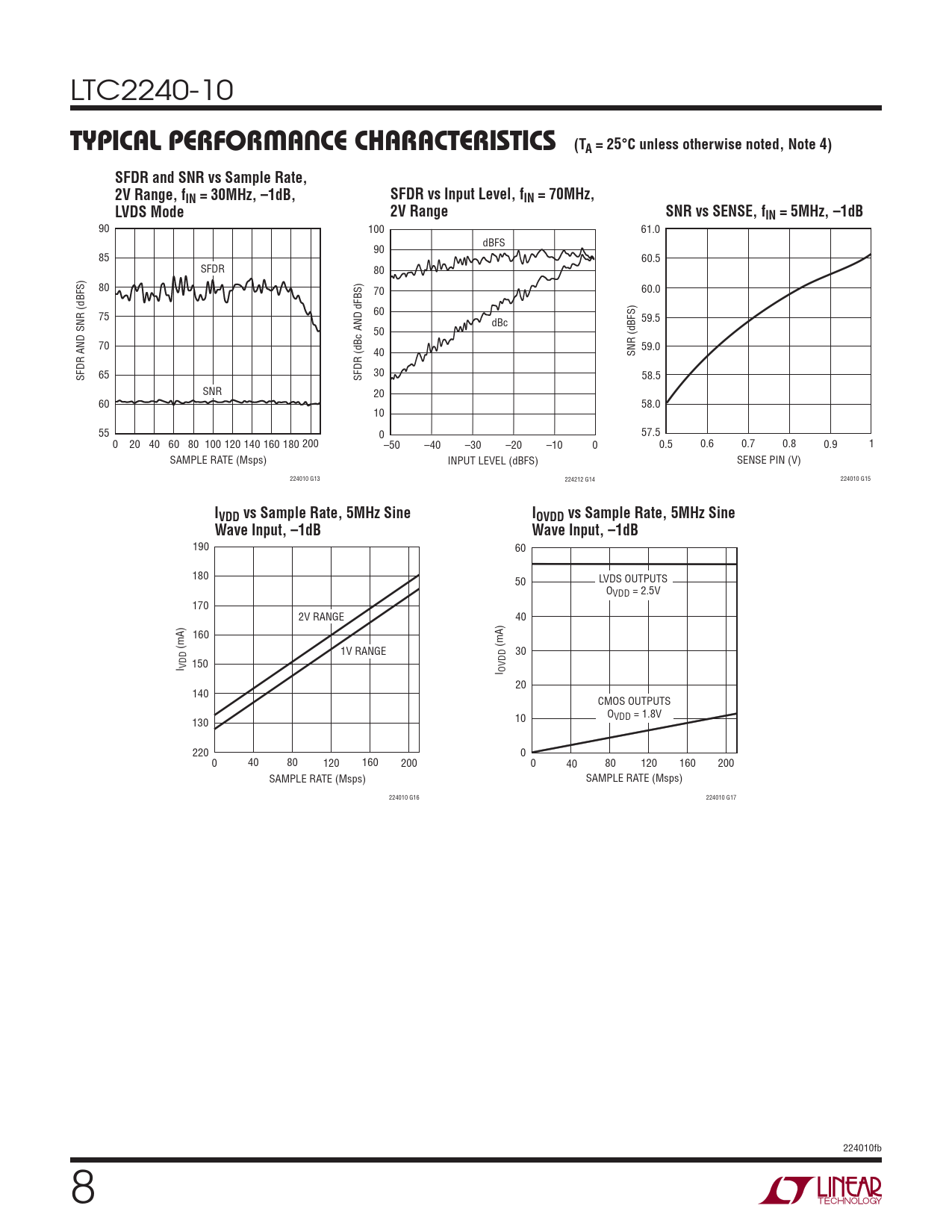 90 100 61.0 dBFS 90 85 60.5 SFDR 80 80 70 60.0 75 60 dBc 59.5 50 70 59.0 40 SNR (dBFS) SFDR AND SNR (dBFS) 65 SFDR (dBc AND dFBS) 30 58.5 SNR 20 60 58.0 10 55 0 57.5 0 20 40 60 80 100 120 140 160 180 200 –50 –40 –30 –20 –10 0 0.5 0.6 0.7 0.8 0.9 1 SAMPLE RATE (Msps) INPUT LEVEL (dBFS) SENSE PIN (V) 224010 G13 224212 G14 224010 G15