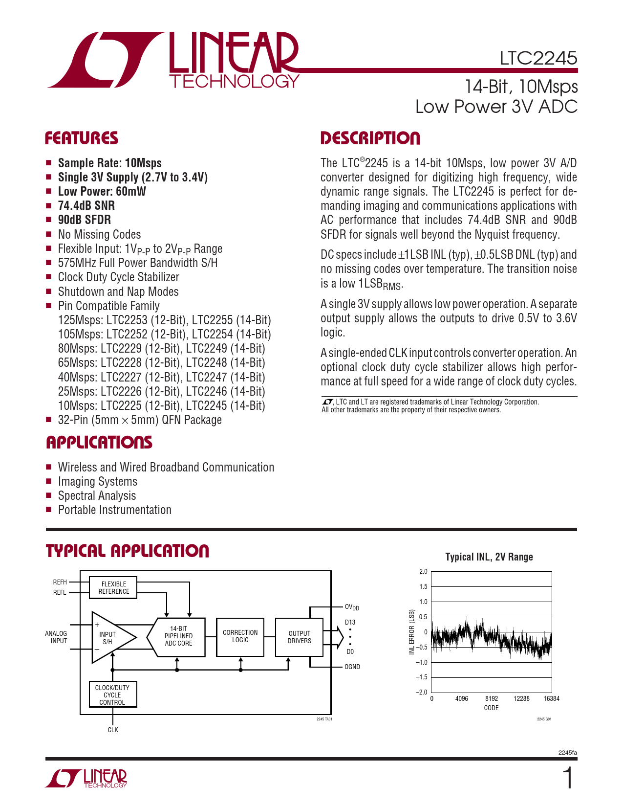 LTC2245 14-Bit, 10Msps Low Power 3V ADC UFEATURESDESCRIPTIO ■ Sample Rate: 10Msps The LTC®2245 is a 14-bit 10Msps, low power 3V A/D ■ Single 3V Supply (2.7V to 3.4V) converter designed for digitizing high frequency, wide ■ Low Power: 60mW dynamic range signals. The LTC2245 is perfect for de- ■ 74.4dB SNR manding imaging and communications applications with ■ 90dB SFDR AC performance that includes 74.4dB SNR and 90dB ■ No Missing Codes SFDR for signals well beyond the Nyquist frequency. ■ Flexible Input: 1VP-P to 2VP-P Range DC specs include ±1LSB INL (typ), ±0.5LSB DNL (typ) and ■ 575MHz Full Power Bandwidth S/H no missing codes over temperature. The transition noise ■ Clock Duty Cycle Stabilizer is a low 1LSB ■ Shutdown and Nap Modes RMS. ■ Pin Compatible Family A single 3V supply allows low power operation. A separate 125Msps: LTC2253 (12-Bit), LTC2255 (14-Bit) output supply allows the outputs to drive 0.5V to 3.6V 105Msps: LTC2252 (12-Bit), LTC2254 (14-Bit) logic. 80Msps: LTC2229 (12-Bit), LTC2249 (14-Bit) A single-ended CLK input controls converter operation. An 65Msps: LTC2228 (12-Bit), LTC2248 (14-Bit) optional clock duty cycle stabilizer allows high perfor- 40Msps: LTC2227 (12-Bit), LTC2247 (14-Bit) mance at full speed for a wide range of clock duty cycles. 25Msps: LTC2226 (12-Bit), LTC2246 (14-Bit) 10Msps: LTC2225 (12-Bit), LTC2245 (14-Bit) , LTC and LT are registered trademarks of Linear Technology Corporation. All other trademarks are the property of their respective owners. ■ 32-Pin (5mm × 5mm) QFN Package UAPPLICATIO S ■ Wireless and Wired Broadband Communication ■ Imaging Systems ■ Spectral Analysis ■ Portable Instrumentation UTYPICAL APPLICATIOTypical INL, 2V Range 2.0 REFH FLEXIBLE 1.5 REFL REFERENCE 1.0 OVDD 0.5 + D13 14-BIT • ANALOG INPUT CORRECTION OUTPUT 0 PIPELINED • INPUT S/H LOGIC DRIVERS ADC CORE • – –0.5 D0 INL ERROR (LSB) –1.0 OGND –1.5 CLOCK/DUTY CYCLE –2.0 0 4096 8192 12288 16384 CONTROL CODE 2245 TA01 2245 G01 CLK 2245fa 1