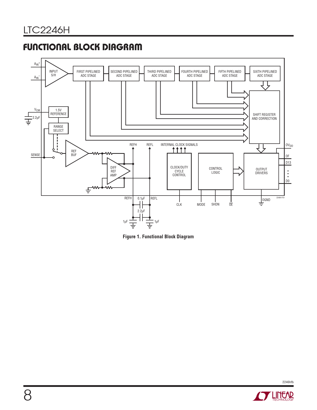 A + IN INPUT FIRST PIPELINED SECOND PIPELINED THIRD PIPELINED FOURTH PIPELINED FIFTH PIPELINED SIXTH PIPELINED – S/H ADC STAGE ADC STAGE ADC STAGE ADC STAGE ADC STAGE ADC STAGE AIN VCM 1.5V REFERENCE SHIFT REGISTER 2.2μF AND CORRECTION RANGE SELECT REFH REFL INTERNAL CLOCK SIGNALS OVDD REF SENSE BUF OF D13 DIFF CLOCK/DUTY CONTROL OUTPUT REF CYCLE LOGIC • DRIVERS AMP CONTROL • • D0 REFH 0.1μF REFL 2246H F01 OGND CLK MODE SHDN OE 2.2μF 1μF 1μF