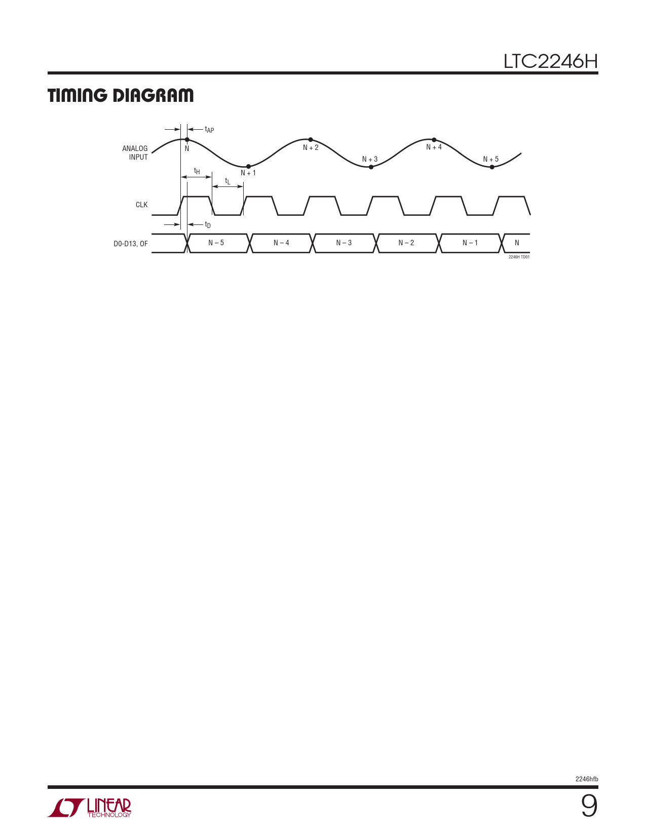tAP N + 2 N + 4 ANALOG N INPUT N + 3 N + 5 tH N + 1 tL CLK tD D0-D13, OF N – 5 N – 4 N – 3 N – 2 N – 1 N 2246H TD01 2246hfb 9