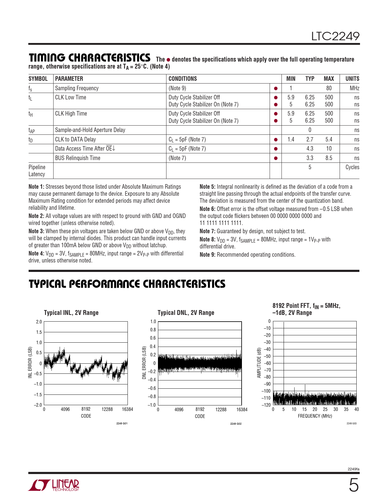 LTC2249 W UTI I G CHARACTERISTICS The ● denotes the specifications which apply over the full operating temperaturerange, otherwise specifications are at TA = 25 ° C. (Note 4)SYMBOLPARAMETERCONDITIONSMINTYPMAXUNITS fs Sampling Frequency (Note 9) ● 1 80 MHz tL CLK Low Time Duty Cycle Stabilizer Off ● 5.9 6.25 500 ns Duty Cycle Stabilizer On (Note 7) ● 5 6.25 500 ns tH CLK High Time Duty Cycle Stabilizer Off ● 5.9 6.25 500 ns Duty Cycle Stabilizer On (Note 7) ● 5 6.25 500 ns tAP Sample-and-Hold Aperture Delay 0 ns tD CLK to DATA Delay CL = 5pF (Note 7) ● 1.4 2.7 5.4 ns Data Access Time After OE↓ CL = 5pF (Note 7) ● 4.3 10 ns BUS Relinquish Time (Note 7) ● 3.3 8.5 ns Pipeline 5 Cycles Latency Note 1: Stresses beyond those listed under Absolute Maximum Ratings Note 5: Integral nonlinearity is defined as the deviation of a code from a may cause permanent damage to the device. Exposure to any Absolute straight line passing through the actual endpoints of the transfer curve. Maximum Rating condition for extended periods may affect device The deviation is measured from the center of the quantization band. reliability and lifetime. Note 6: Offset error is the offset voltage measured from –0.5 LSB when Note 2: All voltage values are with respect to ground with GND and OGND the output code flickers between 00 0000 0000 0000 and wired together (unless otherwise noted). 11 1111 1111 1111. Note 3: When these pin voltages are taken below GND or above VDD, they Note 7: Guaranteed by design, not subject to test. will be clamped by internal diodes. This product can handle input currents Note 8: VDD = 3V, fSAMPLE = 80MHz, input range = 1VP-P with of greater than 100mA below GND or above VDD without latchup. differential drive. Note 4: VDD = 3V, fSAMPLE = 80MHz, input range = 2VP-P with differential Note 9: Recommended operating conditions. drive, unless otherwise noted. WUTYPICAL PERFOR A CE CHARACTERISTICS8192 Point FFT, fIN = 5MHz,Typical INL, 2V RangeTypical DNL, 2V Range–1dB, 2V Range 2.0 1.0 0 0.8 –10 1.5 –20 0.6 1.0 –30 0.4 –40 0.5 0.2 –50 0 0 –60 –0.2 –70 –0.5 INL ERROR (LSB) DNL ERROR (LSB) AMPLITUDE (dB) –80 –0.4 –1.0 –90 –0.6 –100 –1.5 –0.8 –110 –2.0 –1.0 –120 0 4096 8192 12288 16384 0 4096 8192 12288 16384 0 5 10 15 20 25 30 35 40 CODE CODE FREQUENCY (MHz) 2249 G01 2249 G02 2249 G03 2249fa 5