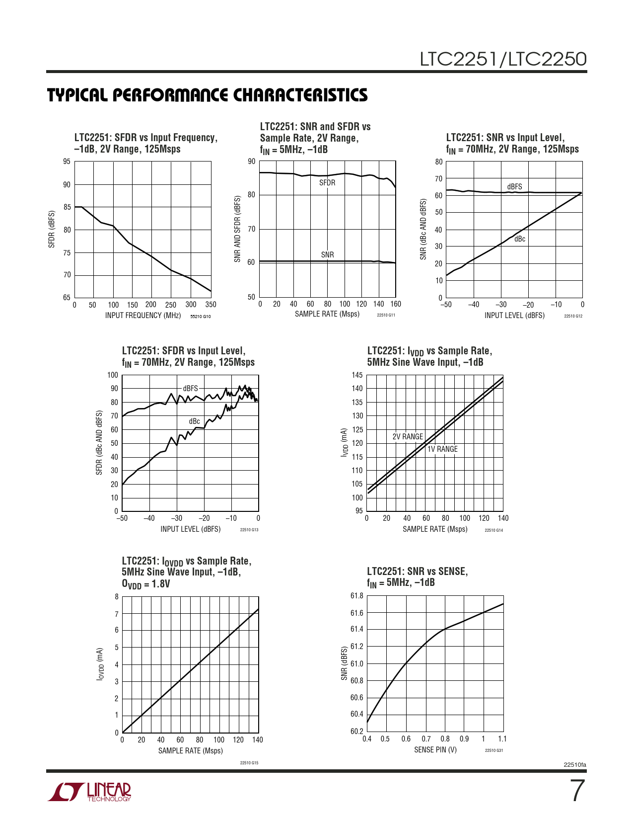 | Pages / Page | 24 / 7 — TYPICAL PERFOR A CE CHARACTERISTICS. LTC2251: SNR and SFDR vs. LTC2251: … |