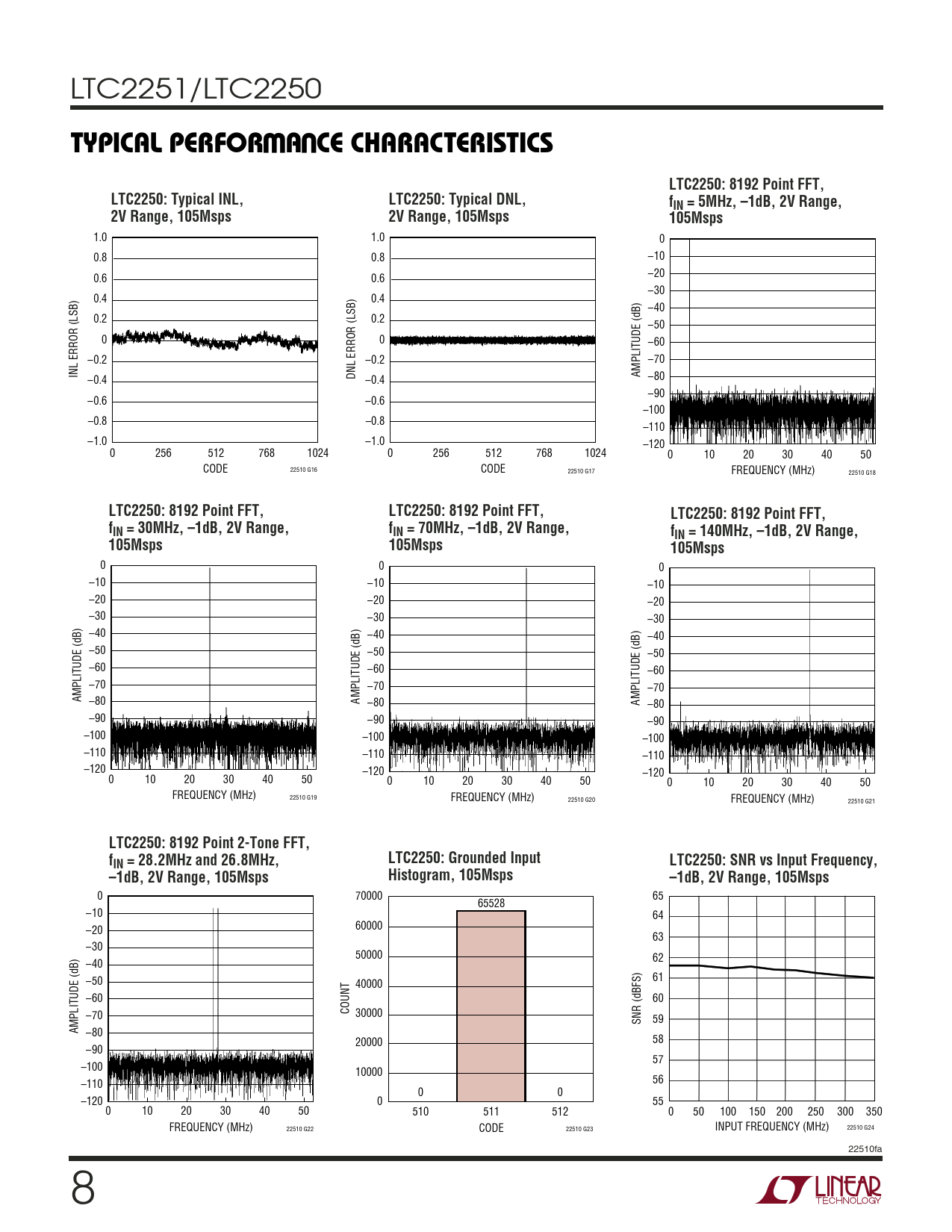 | Pages / Page | 24 / 8 — TYPICAL PERFOR A CE CHARACTERISTICS. LTC2250: 8192 Point FFT,. LTC2250: … |