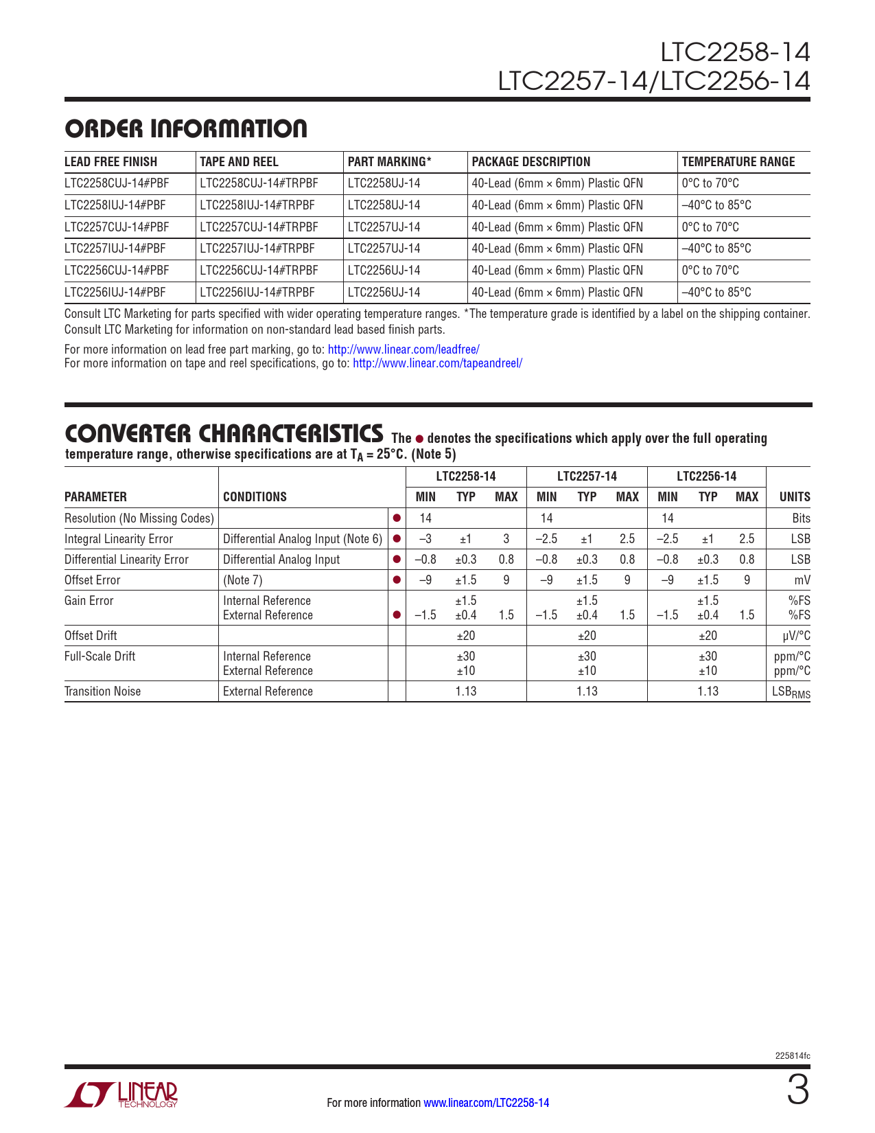 denotes the specifications which apply over the full operating temperature range, otherwise specifications are at TA = 25°C. (Note 5) LTC2258-14 LTC2257-14 LTC2256-14 PARAMETER CONDITIONS MIN TYP MAX MIN TYP MAX MIN TYP MAX UNITS