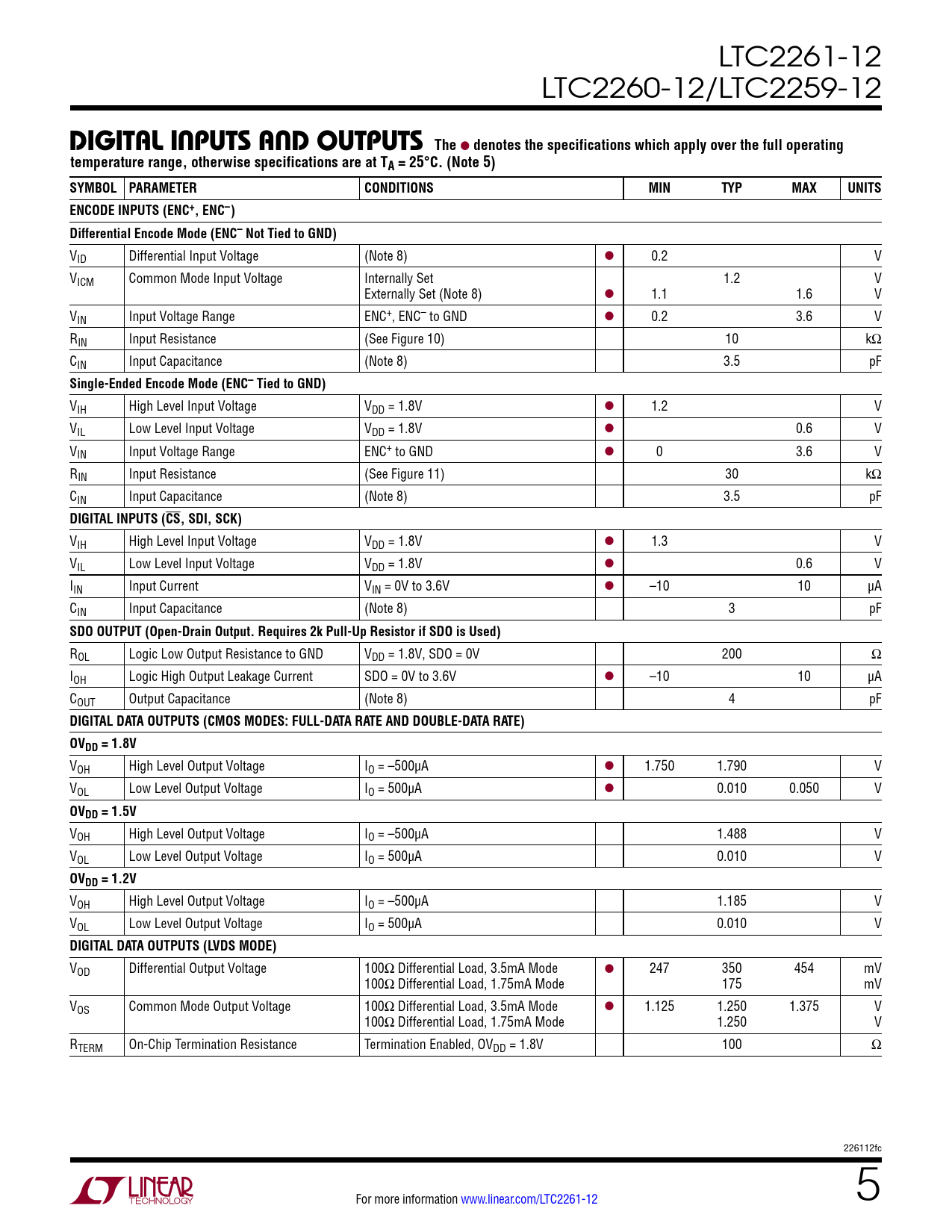 LTC2261-12 LTC2260-12/LTC2259-12 DigiTal inpuTs anD ouTpuTs The l denotes the specifications which apply over the full operatingtemperature range, otherwise specifications are at TA = 25°C. (Note 5)SYMBOL PARAMETERCONDITIONSMINTYPMAXUNITSENCODE INPUTS (ENC+, ENC– ) Differential Encode Mode (ENC– Not Tied to GND) VID Differential Input Voltage (Note 8) l 0.2 V VICM Common Mode Input Voltage Internally Set 1.2 V Externally Set (Note 8) l 1.1 1.6 V VIN Input Voltage Range ENC+, ENC– to GND l 0.2 3.6 V RIN Input Resistance (See Figure 10) 10 kΩ CIN Input Capacitance (Note 8) 3.5 pF Single-Ended Encode Mode (ENC– Tied to GND) VIH High Level Input Voltage VDD = 1.8V l 1.2 V VIL Low Level Input Voltage VDD = 1.8V l 0.6 V VIN Input Voltage Range ENC+ to GND l 0 3.6 V RIN Input Resistance (See Figure 11) 30 kΩ CIN Input Capacitance (Note 8) 3.5 pF DIGITAL INPUTS (CS, SDI, SCK) VIH High Level Input Voltage VDD = 1.8V l 1.3 V VIL Low Level Input Voltage VDD = 1.8V l 0.6 V IIN Input Current VIN = 0V to 3.6V l –10 10 µA CIN Input Capacitance (Note 8) 3 pF SDO OUTPUT (Open-Drain Output. Requires 2k Pull-Up Resistor if SDO is Used) ROL Logic Low Output Resistance to GND VDD = 1.8V, SDO = 0V 200 Ω IOH Logic High Output Leakage Current SDO = 0V to 3.6V l –10 10 µA COUT Output Capacitance (Note 8) 4 pF DIGITAL DATA OUTPUTS (CMOS MODES: FULL-DATA RATE AND DOUBLE-DATA RATE) OVDD = 1.8V VOH High Level Output Voltage IO = –500µA l 1.750 1.790 V VOL Low Level Output Voltage IO = 500µA l 0.010 0.050 V OVDD = 1.5V VOH High Level Output Voltage IO = –500µA 1.488 V VOL Low Level Output Voltage IO = 500µA 0.010 V OVDD = 1.2V VOH High Level Output Voltage IO = –500µA 1.185 V VOL Low Level Output Voltage IO = 500µA 0.010 V DIGITAL DATA OUTPUTS (LVDS MODE) VOD Differential Output Voltage 100Ω Differential Load, 3.5mA Mode l 247 350 454 mV 100Ω Differential Load, 1.75mA Mode 175 mV VOS Common Mode Output Voltage 100Ω Differential Load, 3.5mA Mode l 1.125 1.250 1.375 V 100Ω Differential Load, 1.75mA Mode 1.250 V RTERM On-Chip Termination Resistance Termination Enabled, OVDD = 1.8V 100 Ω 226112fc For more information www.linear.com/LTC2261-12 5 Document Outline Features Description Applications Typical Application Absolute Maximum Ratings Pin Configurations Order Information Converter Characteristics Analog Input Dynamic Accuracy Internal Reference Characteristics Digital Inputs and Outputs Power Requirements Timing Characteristics Timing Diagrams Typical Performance Characteristics Pin Functions Functional Block Diagram Applications Information Typical Applications Package Description Revision History Related Parts