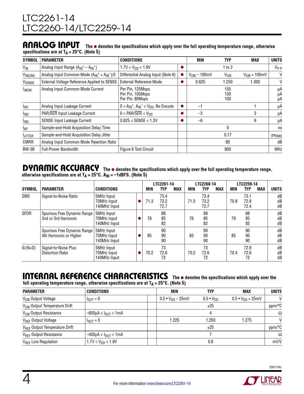 denotes the specifications which apply over the full operating temperature range, otherwise specifications are at TA = 25°C. AIN = –1dBFS. (Note 5) LTC2261-14 LTC2260-14 LTC2259-14 SYMBOL PARAMETER CONDITIONS MIN TYP MAX MIN TYP MAX MIN TYP MAX UNITS