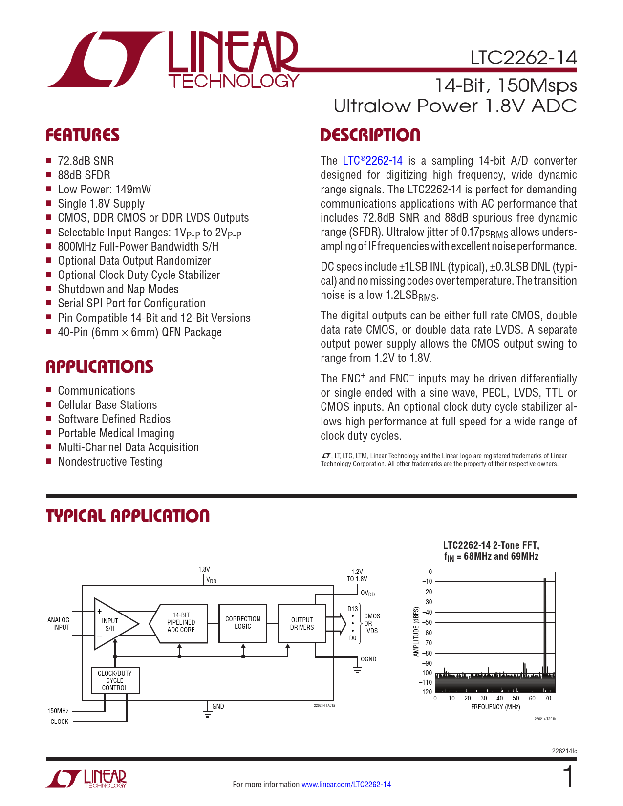 FEATURES. DESCRIPTION. APPLICATIONS. TYPICAL APPLICATION. LTC2262-14 2-Tone FFT,. fIN = 68MHz and 69MHz