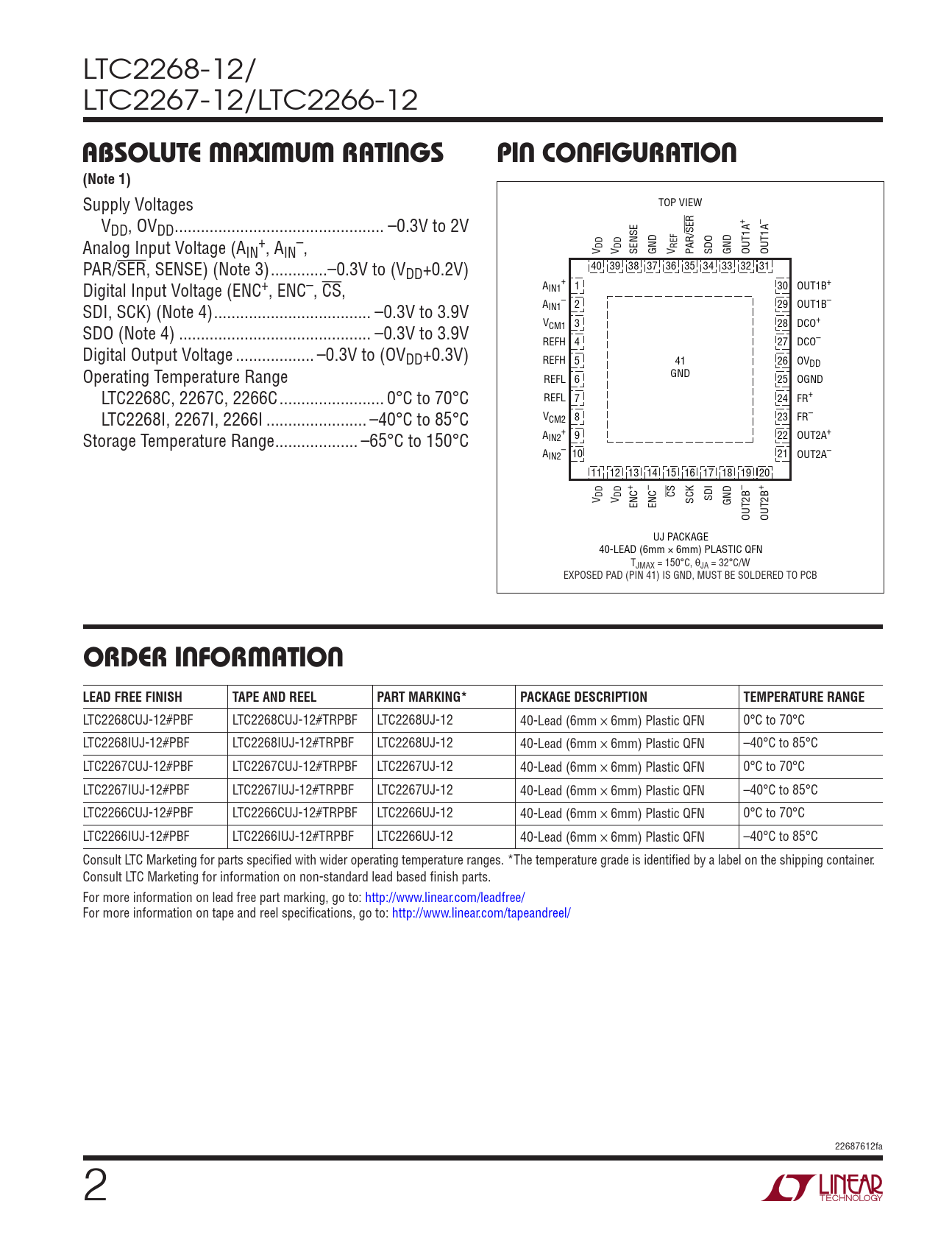 LTC2268CUJ-12#PBF LTC2268CUJ-12#TRPBF LTC2268UJ-12 40-Lead (6mm × 6mm) Plastic QFN 0°C to 70°C LTC2268IUJ-12#PBF LTC2268IUJ-12#TRPBF LTC2268UJ-12 40-Lead (6mm × 6mm) Plastic QFN –40°C to 85°C LTC2267CUJ-12#PBF LTC2267CUJ-12#TRPBF LTC2267UJ-12 40-Lead (6mm × 6mm) Plastic QFN 0°C to 70°C LTC2267IUJ-12#PBF LTC2267IUJ-12#TRPBF LTC2267UJ-12 40-Lead (6mm × 6mm) Plastic QFN –40°C to 85°C LTC2266CUJ-12#PBF LTC2266CUJ-12#TRPBF LTC2266UJ-12 40-Lead (6mm × 6mm) Plastic QFN 0°C to 70°C LTC2266IUJ-12#PBF LTC2266IUJ-12#TRPBF LTC2266UJ-12 40-Lead (6mm × 6mm) Plastic QFN –40°C to 85°C Consult LTC Marketing for parts specified with wider operating temperature ranges. *The temperature grade is identified by a label on the shipping container. Consult LTC Marketing for information on non-standard lead based finish parts. For more information on lead free part marking, go to: http://www.linear.com/leadfree/ For more information on tape and reel specifications, go to: http://www.linear.com/tapeandreel/ 22687612fa 2 Document Outline Features Description Applications Typical Application Absolute Maximum Ratings Pin Configuration Order Information Converter Characteristics Analog Input Digital Accuracy Internal Reference Characteristics Digital Inputs and Outputs Power Requirements Timing Characteristics Electrical Characteristics Timing Diagrams Typical Performance Characteristics Pin Functions Block Diagram Applications Information Typical Applications Package Description Revision History Related Parts
