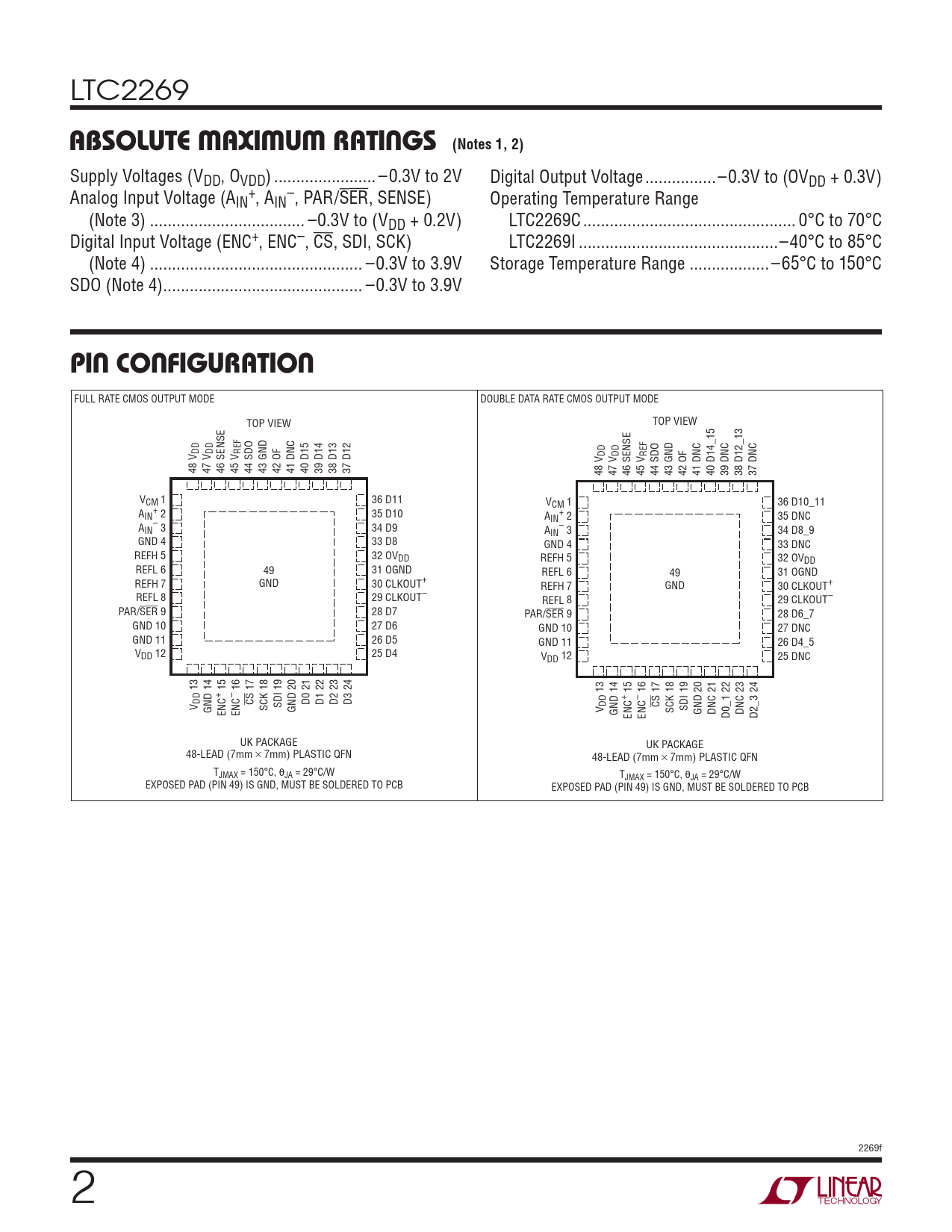Supply Voltages (VDD, OVDD) ... –0.3V to 2V Digital Output Voltage .. –0.3V to (OVDD + 0.3V) Analog Input Voltage (A + – IN , AIN , PAR/SER, SENSE) Operating Temperature Range (Note 3) ... –0.3V to (VDD + 0.2V) LTC2269C .. 0°C to 70°C Digital Input Voltage (ENC+, ENC–, CS, SDI, SCK) LTC2269I ...–40°C to 85°C (Note 4) .. –0.3V to 3.9V Storage Temperature Range .. –65°C to 150°C SDO (Note 4) ... –0.3V to 3.9V