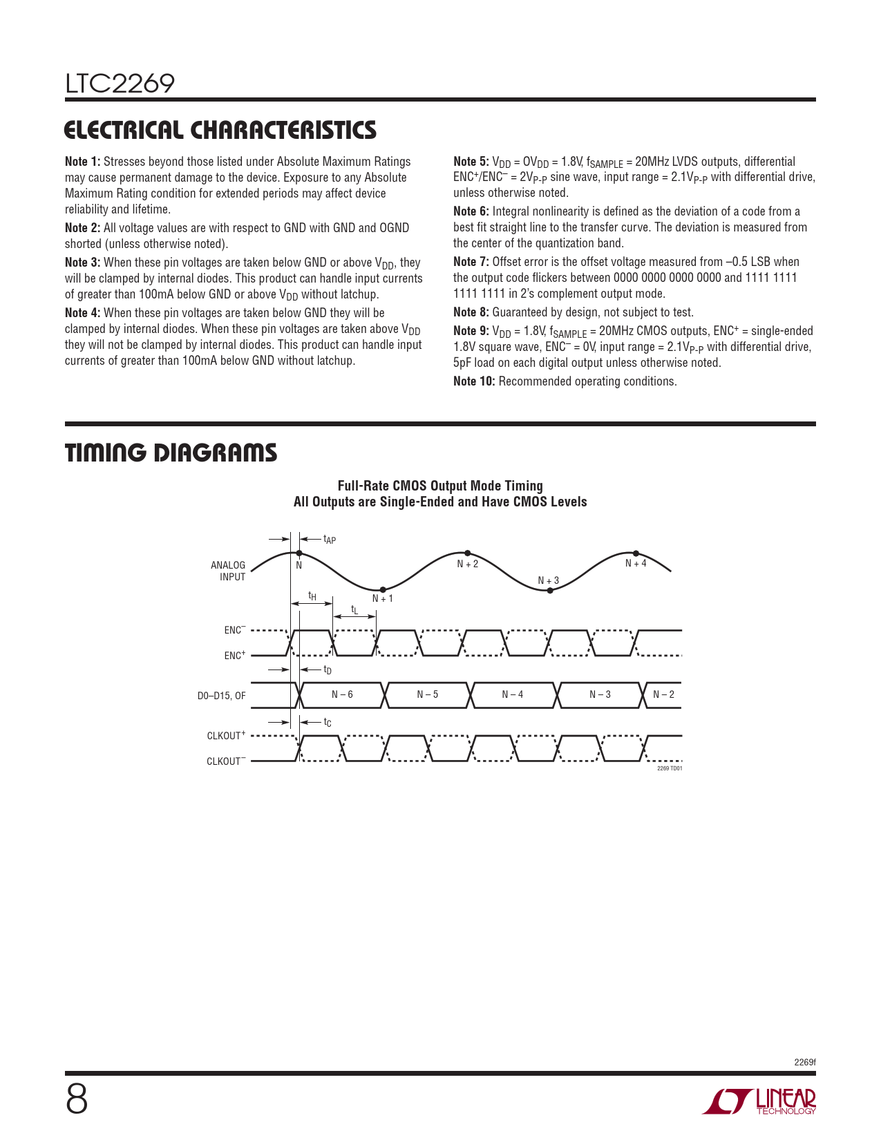tAP N + 2 N + 4 ANALOG N INPUT N + 3 tH N + 1 tL ENC– ENC+ tD D0–D15, OF N – 6 N – 5 N – 4 N – 3 N – 2 tC CLKOUT+ CLKOUT– 2269 TD01 2269f 8