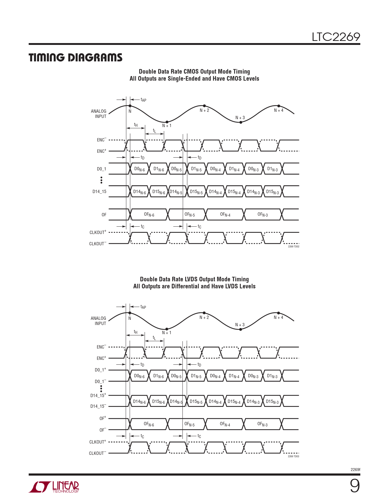 tAP N + 2 N + 4 ANALOG N INPUT N + 3 tH N + 1 tL ENC– ENC+ tD tD D0_1+ D0N-6 D1N-6 D0N-5 D1N-5 D0N-4 D1N-4 D0N-3 D1N-3 D0_1– ttt D14_15+ D14N-6 D15N-6 D14N-5 D15N-5 D14N-4 D15N-4 D14N-3 D15N-3 D14_15– OF+ OFN-6 OFN-5 OFN-4 OFN-3 OF– tC tC CLKOUT+ CLKOUT– 2269 TD03 2269f 9