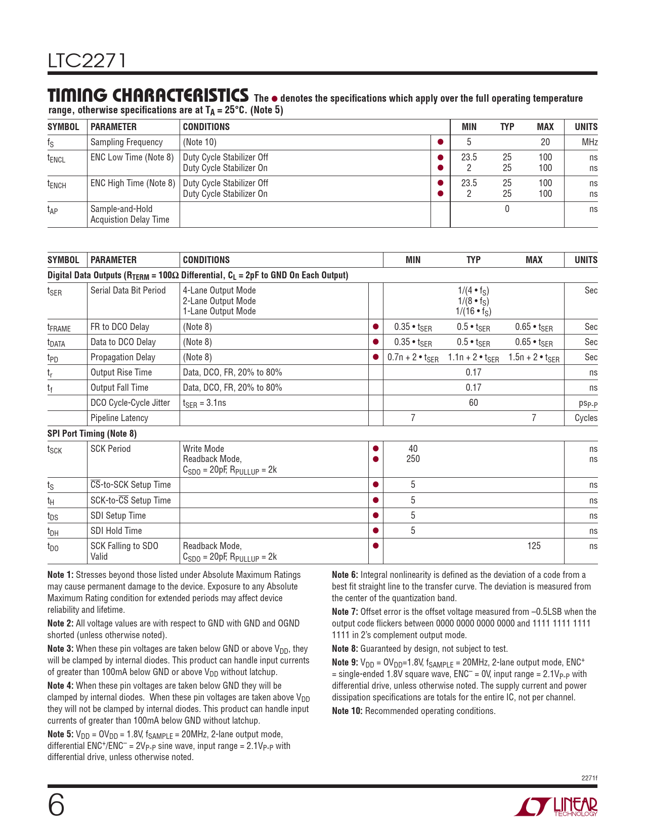 LTC2271 TIMING CHARACTERISTICSThe l denotes the specifi cations which apply over the full operating temperaturerange, otherwise specifi cations are at TA = 25°C. (Note 5)SYMBOLPARAMETERCONDITIONSMINTYPMAXUNITS fS Sampling Frequency (Note 10) l 5 20 MHz tENCL ENC Low Time (Note 8) Duty Cycle Stabilizer Off l 23.5 25 100 ns Duty Cycle Stabilizer On l 2 25 100 ns tENCH ENC High Time (Note 8) Duty Cycle Stabilizer Off l 23.5 25 100 ns Duty Cycle Stabilizer On l 2 25 100 ns tAP Sample-and-Hold 0 ns Acquistion Delay Time SYMBOLPARAMETERCONDITIONSMINTYPMAXUNITSDigital Data Outputs (RTERM = 100Ω Differential, CL = 2pF to GND On Each Output) tSER Serial Data Bit Period 4-Lane Output Mode 1/(4 • fS) Sec 2-Lane Output Mode 1/(8 • fS) 1-Lane Output Mode 1/(16 • fS) tFRAME FR to DCO Delay (Note 8) l 0.35 • tSER 0.5 • tSER 0.65 • tSER Sec tDATA Data to DCO Delay (Note 8) l 0.35 • tSER 0.5 • tSER 0.65 • tSER Sec tPD Propagation Delay (Note 8) l 0.7n + 2 • tSER 1.1n + 2 • tSER 1.5n + 2 • tSER Sec tr Output Rise Time Data, DCO, FR, 20% to 80% 0.17 ns tf Output Fall Time Data, DCO, FR, 20% to 80% 0.17 ns DCO Cycle-Cycle Jitter tSER = 3.1ns 60 psP-P Pipeline Latency 7 7 Cycles SPI Port Timing (Note 8) tSCK SCK Period Write Mode l 40 ns Readback Mode, l 250 ns CSDO = 20pF, RPULLUP = 2k tS CS-to-SCK Setup Time l 5 ns tH SCK-to-CS Setup Time l 5 ns tDS SDI Setup Time l 5 ns tDH SDI Hold Time l 5 ns tDO SCK Falling to SDO Readback Mode, l 125 ns Valid CSDO = 20pF, RPULLUP = 2k Note 1: Stresses beyond those listed under Absolute Maximum Ratings Note 6: Integral nonlinearity is defi ned as the deviation of a code from a may cause permanent damage to the device. Exposure to any Absolute best fi t straight line to the transfer curve. The deviation is measured from Maximum Rating condition for extended periods may affect device the center of the quantization band. reliability and lifetime. Note 7: Offset error is the offset voltage measured from –0.5LSB when the Note 2: All voltage values are with respect to GND with GND and OGND output code fl ickers between 0000 0000 0000 0000 and 1111 1111 1111 shorted (unless otherwise noted). 1111 in 2’s complement output mode. Note 3: When these pin voltages are taken below GND or above VDD, they Note 8: Guaranteed by design, not subject to test. will be clamped by internal diodes. This product can handle input currents Note 9: VDD = OVDD=1.8V, fSAMPLE = 20MHz, 2-lane output mode, ENC+ of greater than 100mA below GND or above VDD without latchup. = single-ended 1.8V square wave, ENC– = 0V, input range = 2.1VP-P with Note 4: When these pin voltages are taken below GND they will be differential drive, unless otherwise noted. The supply current and power clamped by internal diodes. When these pin voltages are taken above VDD dissipation specifi cations are totals for the entire IC, not per channel. they will not be clamped by internal diodes. This product can handle input Note 10: Recommended operating conditions. currents of greater than 100mA below GND without latchup. Note 5: VDD = OVDD = 1.8V, fSAMPLE = 20MHz, 2-lane output mode, differential ENC+/ENC– = 2VP-P sine wave, input range = 2.1VP-P with differential drive, unless otherwise noted. 2271f 6