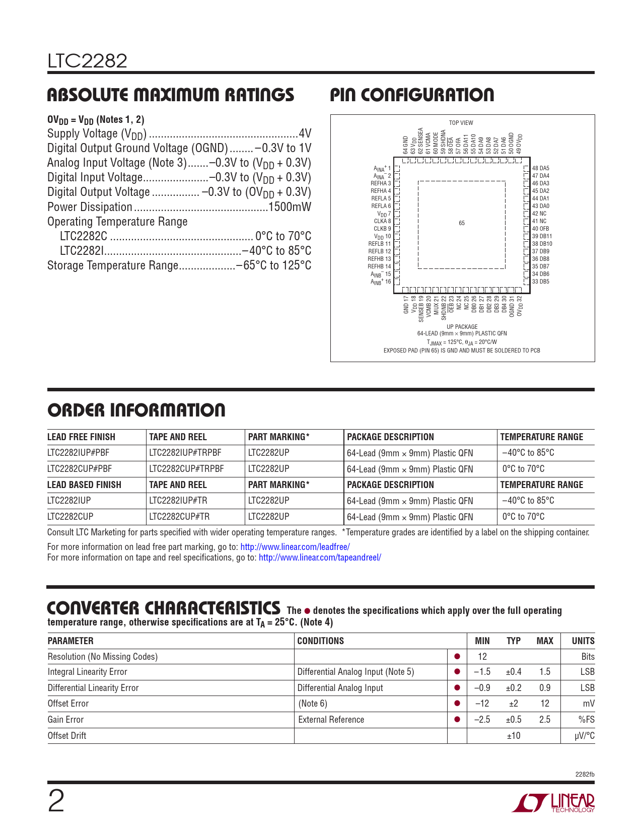 LTC2282 ABSOLUTE MAXIMUM RATINGSPIN CONFIGURATIONOVDD = VDD (Notes 1, 2) TOP VIEW Supply Voltage (VDD) ..4V A DD DD Digital Output Ground Voltage (OGND) .. –0.3V to 1V 64 GND 63 V 62 SENSEA 61 VCMA 60 MODE 59 SHDNA 58 OEA 57 OF 56 DA11 55 DA10 54 DA9 53 DA8 52 DA7 51 DA6 50 OGND 49 OV Analog Input Voltage (Note 3) ...–0.3V to (VDD + 0.3V) A + INA 1 48 DA5 Digital Input Voltage ..–0.3V to (V A – 2 47 DA4 DD + 0.3V) INA REFHA 3 46 DA3 Digital Output Voltage .. –0.3V to (OVDD + 0.3V) REFHA 4 45 DA2 REFLA 5 44 DA1 Power Dissipation ...1500mW REFLA 6 43 DA0 VDD 7 42 NC Operating Temperature Range CLKA 8 41 NC 65 CLKB 9 40 OFB LTC2282C .. 0°C to 70°C VDD 10 39 DB11 REFLB 11 38 DB10 LTC2282I..–40°C to 85°C REFLB 12 37 DB9 REFHB 13 36 DB8 Storage Temperature Range ...–65°C to 125°C REFHB 14 35 DB7 A – INB 15 34 DB6 A + INB 16 33 DB5 17 18 19 20 32 DD NC 24 NC 25 DD GND V OEB 23 DB0 26 DB1 27 DB2 28 DB3 29 DB4 30 VCMB MUX 21 OGND 31 OV SENSEB SHDNB 22 UP PACKAGE 64-LEAD (9mm s 9mm) PLASTIC QFN TJMAX = 125°C, QJA = 20°C/W EXPOSED PAD (PIN 65) IS GND AND MUST BE SOLDERED TO PCB ORDER INFORMATIONLEAD FREE FINISHTAPE AND REELPART MARKING*PACKAGE DESCRIPTIONTEMPERATURE RANGE LTC2282IUP#PBF LTC2282IUP#TRPBF LTC2282UP 64-Lead (9mm × 9mm) Plastic QFN –40°C to 85°C LTC2282CUP#PBF LTC2282CUP#TRPBF LTC2282UP 64-Lead (9mm × 9mm) Plastic QFN 0°C to 70°C LEAD BASED FINISHTAPE AND REELPART MARKING*PACKAGE DESCRIPTIONTEMPERATURE RANGE LTC2282IUP LTC2282IUP#TR LTC2282UP 64-Lead (9mm × 9mm) Plastic QFN –40°C to 85°C LTC2282CUP LTC2282CUP#TR LTC2282UP 64-Lead (9mm × 9mm) Plastic QFN 0°C to 70°C Consult LTC Marketing for parts specifi ed with wider operating temperature ranges. *Temperature grades are identifi ed by a label on the shipping container. For more information on lead free part marking, go to: http://www.linear.com/leadfree/ For more information on tape and reel specifi cations, go to: http://www.linear.com/tapeandreel/ CONVERTER CHARACTERISTICSThe l denotes the specifi cations which apply over the full operatingtemperature range, otherwise specifi cations are at TA = 25°C. (Note 4)PARAMETERCONDITIONSMINTYPMAXUNITS Resolution (No Missing Codes) l 12 Bits Integral Linearity Error Differential Analog Input (Note 5) l –1.5 ±0.4 1.5 LSB Differential Linearity Error Differential Analog Input l –0.9 ±0.2 0.9 LSB Offset Error (Note 6) l –12 ±2 12 mV Gain Error External Reference l –2.5 ±0.5 2.5 %FS Offset Drift ±10 μV/°C 2282fb 2