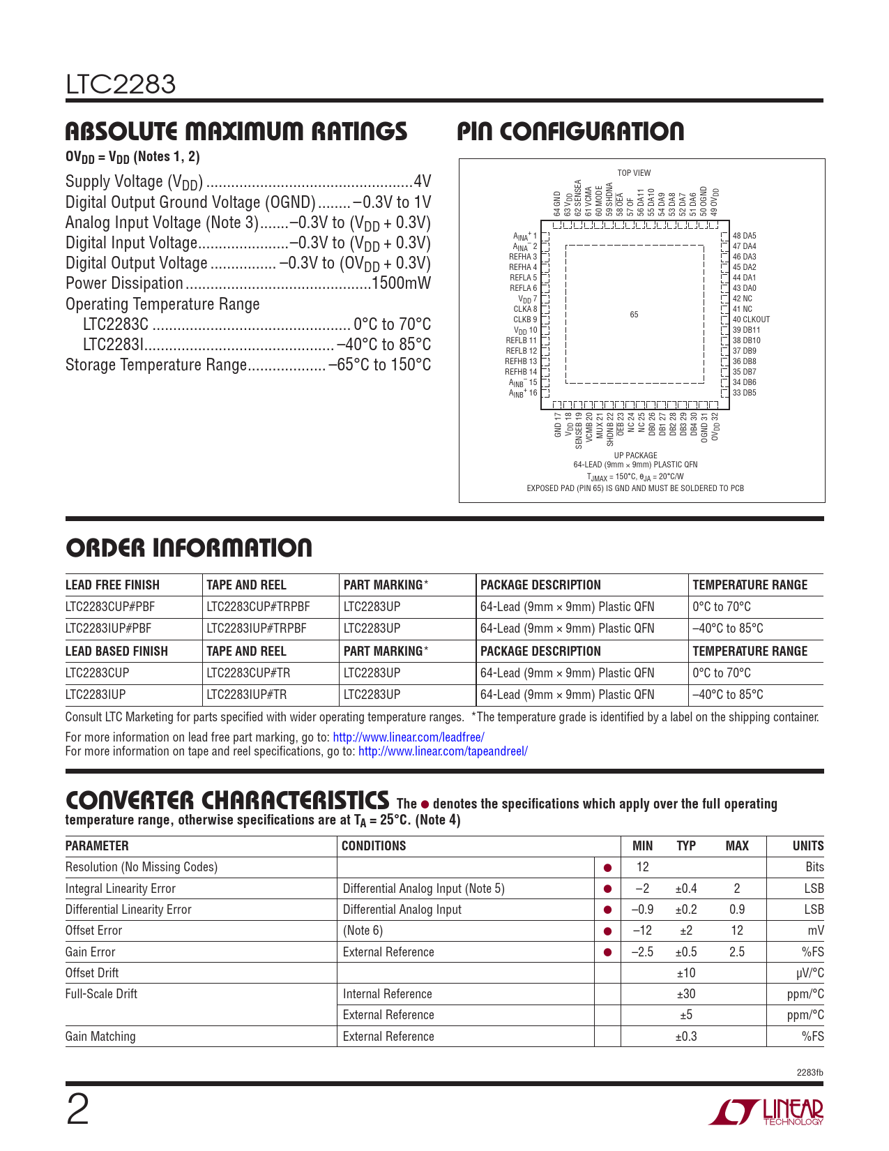 LTC2283 ABSOLUTE MAXIMUM RATINGSPIN CONFIGURATIONOVDD = VDD (Notes 1, 2) TOP VIEW Supply Voltage (VDD) ..4V DD Digital Output Ground Voltage (OGND) .. –0.3V to 1V DD OEA 64 GND 63 V 62 SENSEA 61 VCMA 60 MODE 59 SHDNA 58 57 OF 56 DA11 55 DA10 54 DA9 53 DA8 52 DA7 51 DA6 50 OGND 49 OV Analog Input Voltage (Note 3) ...–0.3V to (VDD + 0.3V) + Digital Input Voltage ..–0.3V to (V AINA 1 48 DA5 DD + 0.3V) A – INA 2 47 DA4 Digital Output Voltage .. –0.3V to (OV REFHA 3 46 DA3 DD + 0.3V) REFHA 4 45 DA2 Power Dissipation ...1500mW REFLA 5 44 DA1 REFLA 6 43 DA0 Operating Temperature Range VDD 7 42 NC CLKA 8 41 NC 65 LTC2283C .. 0°C to 70°C CLKB 9 40 CLKOUT VDD 10 39 DB11 LTC2283I.. –40°C to 85°C REFLB 11 38 DB10 REFLB 12 37 DB9 Storage Temperature Range ... –65°C to 150°C REFHB 13 36 DB8 REFHB 14 35 DB7 A – INB 15 34 DB6 A + INB 16 33 DB5 17 18 19 20 23 32 DD NC 24 NC 25 DD GND V OEB DB0 26 DB1 27 DB2 28 DB3 29 DB4 30 VCMB MUX 21 OGND 31 OV SENSEB SHDNB 22 UP PACKAGE 64-LEAD (9mm × 9mm) PLASTIC QFN TJMAX = 150°C, θJA = 20°C/W EXPOSED PAD (PIN 65) IS GND AND MUST BE SOLDERED TO PCB ORDER INFORMATIONLEAD FREE FINISHTAPE AND REELPART MARKING * PACKAGE DESCRIPTIONTEMPERATURE RANGE LTC2283CUP#PBF LTC2283CUP#TRPBF LTC2283UP 64-Lead (9mm × 9mm) Plastic QFN 0°C to 70°C LTC2283IUP#PBF LTC2283IUP#TRPBF LTC2283UP 64-Lead (9mm × 9mm) Plastic QFN –40°C to 85°C LEAD BASED FINISHTAPE AND REELPART MARKING * PACKAGE DESCRIPTIONTEMPERATURE RANGE LTC2283CUP LTC2283CUP#TR LTC2283UP 64-Lead (9mm × 9mm) Plastic QFN 0°C to 70°C LTC2283IUP LTC2283IUP#TR LTC2283UP 64-Lead (9mm × 9mm) Plastic QFN –40°C to 85°C Consult LTC Marketing for parts specifi ed with wider operating temperature ranges. *The temperature grade is identifi ed by a label on the shipping container. For more information on lead free part marking, go to: http://www.linear.com/leadfree/ For more information on tape and reel specifi cations, go to: http://www.linear.com/tapeandreel/ TheCONVERTER CHARACTERISTICS l denotes the specifi cations which apply over the full operatingtemperature range, otherwise specifi cations are at TA = 25°C. (Note 4)PARAMETERCONDITIONSMINTYPMAXUNITS Resolution (No Missing Codes) ● 12 Bits Integral Linearity Error Differential Analog Input (Note 5) ● –2 ±0.4 2 LSB Differential Linearity Error Differential Analog Input ● –0.9 ±0.2 0.9 LSB Offset Error (Note 6) ● –12 ±2 12 mV Gain Error External Reference ● –2.5 ±0.5 2.5 %FS Offset Drift ±10 μV/°C Full-Scale Drift Internal Reference ±30 ppm/°C External Reference ±5 ppm/°C Gain Matching External Reference ±0.3 %FS 2283fb 2