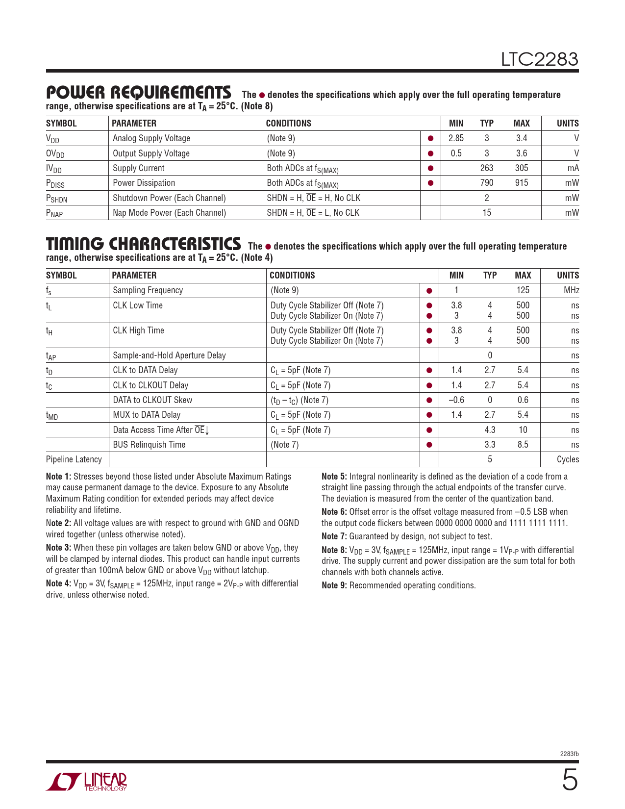 LTC2283 ThePOWER REQUIREMENTS l denotes the specifi cations which apply over the full operating temperaturerange, otherwise specifi cations are at TA = 25°C. (Note 8)SYMBOLPARAMETERCONDITIONSMINTYPMAXUNITS VDD Analog Supply Voltage (Note 9) ● 2.85 3 3.4 V OVDD Output Supply Voltage (Note 9) ● 0.5 3 3.6 V IVDD Supply Current Both ADCs at fS(MAX) ● 263 305 mA PDISS Power Dissipation Both ADCs at fS(MAX) ● 790 915 mW PSHDN Shutdown Power (Each Channel) SHDN = H, OE = H, No CLK 2 mW PNAP Nap Mode Power (Each Channel) SHDN = H, OE = L, No CLK 15 mW TheTIMING CHARACTERISTICS l denotes the specifi cations which apply over the full operating temperaturerange, otherwise specifi cations are at TA = 25°C. (Note 4)SYMBOLPARAMETERCONDITIONSMINTYPMAXUNITS fs Sampling Frequency (Note 9) ● 1 125 MHz tL CLK Low Time Duty Cycle Stabilizer Off (Note 7) ● 3.8 4 500 ns Duty Cycle Stabilizer On (Note 7) ● 3 4 500 ns tH CLK High Time Duty Cycle Stabilizer Off (Note 7) ● 3.8 4 500 ns Duty Cycle Stabilizer On (Note 7) ● 3 4 500 ns tAP Sample-and-Hold Aperture Delay 0 ns tD CLK to DATA Delay CL = 5pF (Note 7) ● 1.4 2.7 5.4 ns tC CLK to CLKOUT Delay CL = 5pF (Note 7) ● 1.4 2.7 5.4 ns DATA to CLKOUT Skew (tD – tC) (Note 7) ● –0.6 0 0.6 ns tMD MUX to DATA Delay CL = 5pF (Note 7) ● 1.4 2.7 5.4 ns Data Access Time After OE↓ CL = 5pF (Note 7) ● 4.3 10 ns BUS Relinquish Time (Note 7) ● 3.3 8.5 ns Pipeline Latency 5 Cycles Note 1: Stresses beyond those listed under Absolute Maximum Ratings Note 5: Integral nonlinearity is defi ned as the deviation of a code from a may cause permanent damage to the device. Exposure to any Absolute straight line passing through the actual endpoints of the transfer curve. Maximum Rating condition for extended periods may affect device The deviation is measured from the center of the quantization band. reliability and lifetime. Note 6: Offset error is the offset voltage measured from –0.5 LSB when N ote 2: All voltage values are with respect to ground with GND and OGND the output code fl ickers between 0000 0000 0000 and 1111 1111 1111. wired together (unless otherwise noted). Note 7: Guaranteed by design, not subject to test. Note 3: When these pin voltages are taken below GND or above VDD, they Note 8: VDD = 3V, fSAMPLE = 125MHz, input range = 1VP-P with differential will be clamped by internal diodes. This product can handle input currents drive. The supply current and power dissipation are the sum total for both of greater than 100mA below GND or above VDD without latchup. channels with both channels active. Note 4: VDD = 3V, fSAMPLE = 125MHz, input range = 2VP-P with differential Note 9: Recommended operating conditions. drive, unless otherwise noted. 2283fb 5