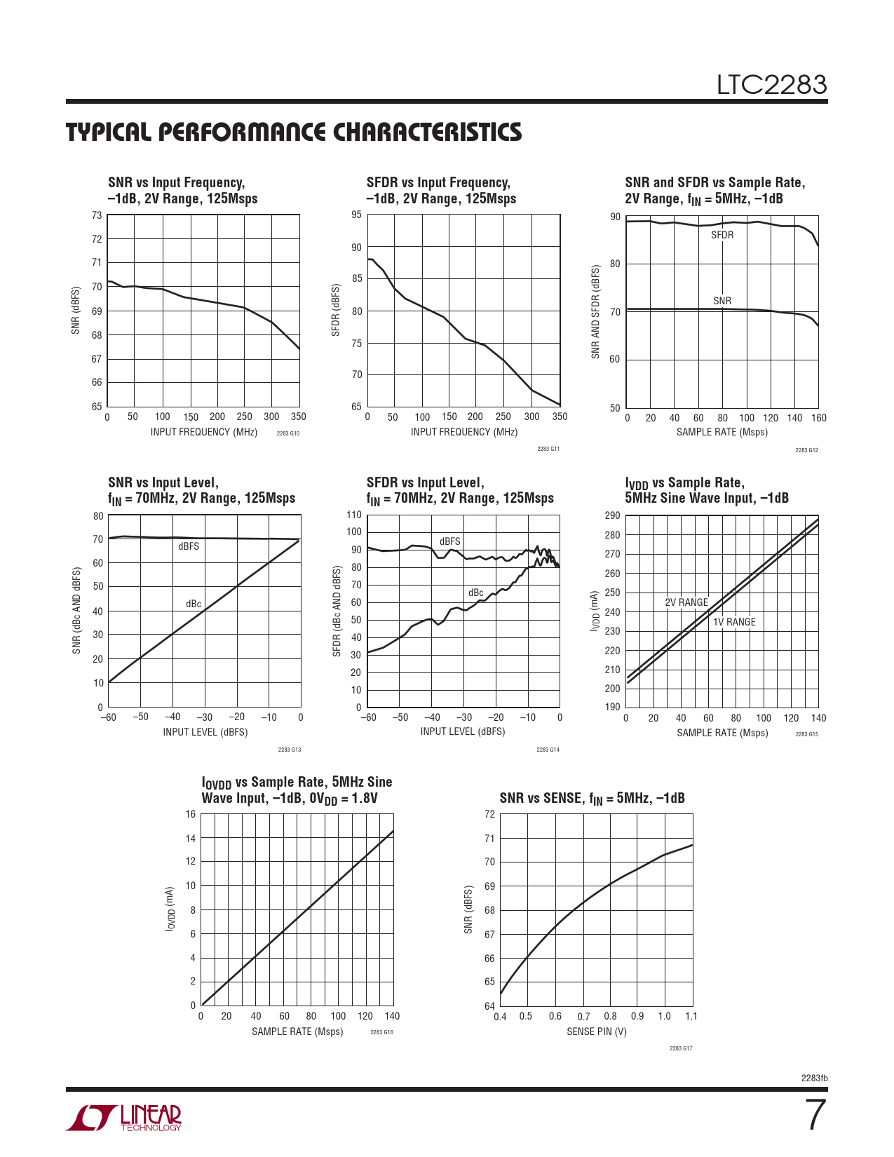 16 72 14 71 12 70 10 69 (mA) 8 68 I OVDD 6 SNR (dBFS) 67 4 66 2 65 0 64 0 20 40 60 80 100 120 140 0.4 0.5 0.6 0.7 0.8 0.9 1.0 1.1 SAMPLE RATE (Msps) 2283 G16 SENSE PIN (V) 2283 G17 2283fb 7