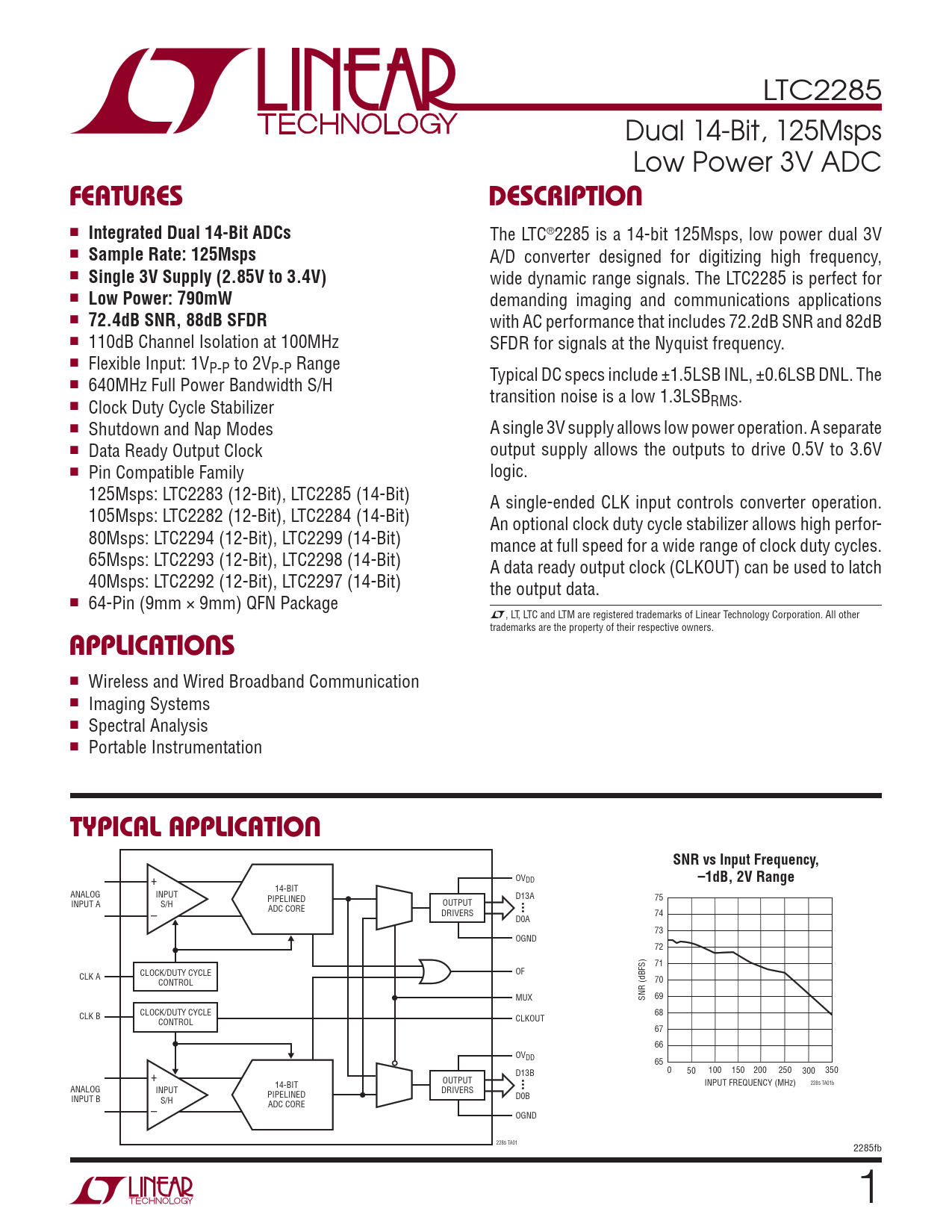LTC2285 Dual 14-Bit, 125Msps Low Power 3V ADC FEATURESDESCRIPTION n Integrated Dual 14-Bit ADCs The LTC®2285 is a 14-bit 125Msps, low power dual 3V n Sample Rate: 125Msps A/D converter designed for digitizing high frequency, n Single 3V Supply (2.85V to 3.4V) wide dynamic range signals. The LTC2285 is perfect for n Low Power: 790mW demanding imaging and communications applications n 72.4dB SNR, 88dB SFDR with AC performance that includes 72.2dB SNR and 82dB n 110dB Channel Isolation at 100MHz SFDR for signals at the Nyquist frequency. n Flexible Input: 1VP-P to 2VP-P Range Typical DC specs include ±1.5LSB INL, ±0.6LSB DNL. The n 640MHz Full Power Bandwidth S/H transition noise is a low 1.3LSBRMS. n Clock Duty Cycle Stabilizer n Shutdown and Nap Modes A single 3V supply allows low power operation. A separate n Data Ready Output Clock output supply allows the outputs to drive 0.5V to 3.6V n Pin Compatible Family logic. 125Msps: LTC2283 (12-Bit), LTC2285 (14-Bit) A single-ended CLK input controls converter operation. 105Msps: LTC2282 (12-Bit), LTC2284 (14-Bit) An optional clock duty cycle stabilizer allows high perfor- 80Msps: LTC2294 (12-Bit), LTC2299 (14-Bit) mance at full speed for a wide range of clock duty cycles. 65Msps: LTC2293 (12-Bit), LTC2298 (14-Bit) A data ready output clock (CLKOUT) can be used to latch 40Msps: LTC2292 (12-Bit), LTC2297 (14-Bit) the output data. n 64-Pin (9mm × 9mm) QFN Package L, LT, LTC and LTM are registered trademarks of Linear Technology Corporation. All other trademarks are the property of their respective owners. APPLICATIONS n Wireless and Wired Broadband Communication n Imaging Systems n Spectral Analysis n Portable Instrumentation TYPICAL APPLICATIONSNR vs Input Frequency, OVDD –1dB, 2V Range + 14-BIT ANALOG INPUT PIPELINED D13A 75 INPUT A S/H OUTPUT • ADC CORE • – DRIVERS • 74 D0A 73 OGND 72 71 OF CLK A CLOCK/DUTY CYCLE CONTROL 70 MUX SNR (dBFS) 69 CLK B CLOCK/DUTY CYCLE 68 CLKOUT CONTROL 67 66 OVDD 65 D13B 0 50 100 150 200 250 300 350 + OUTPUT • 14-BIT • INPUT FREQUENCY (MHz) 2285 TA01b ANALOG • INPUT DRIVERS PIPELINED INPUT B D0B S/H ADC CORE – OGND 2285 TA01 2285fb 1
