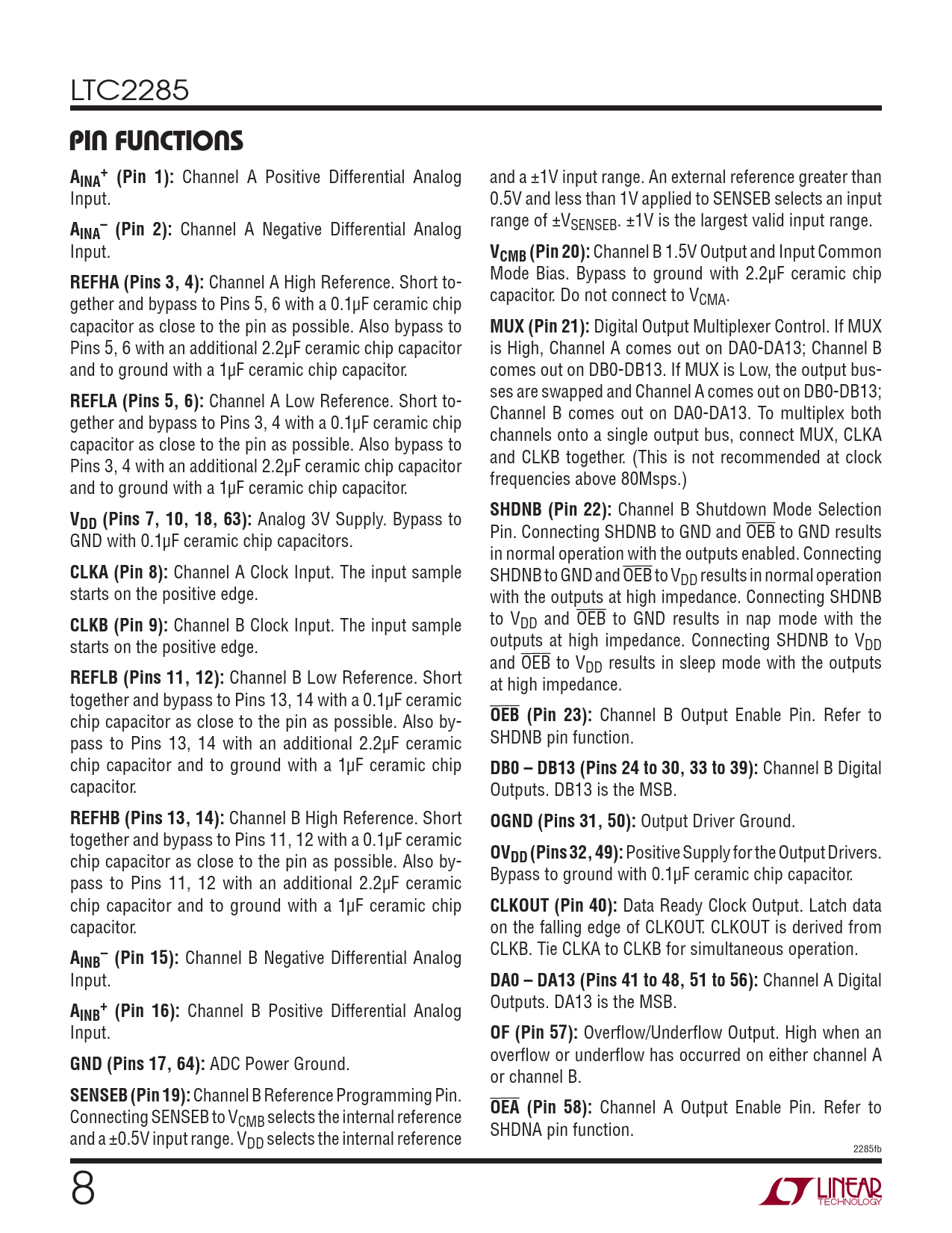 Channel A Output Enable Pin. Refer to Connecting SENSEB to VCMB selects the internal reference SHDNA pin function. and a ±0.5V input range. VDD selects the internal reference 2285fb 8