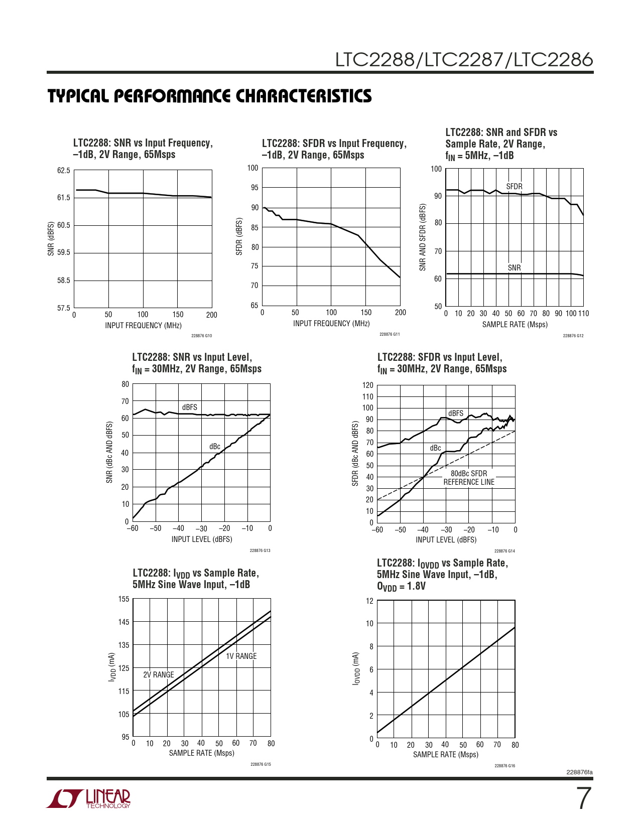 | Pages / Page | 28 / 7 — TYPICAL PERFOR A CE CHARACTERISTICS. LTC2288: SNR and SFDR vs. LTC2288: … |