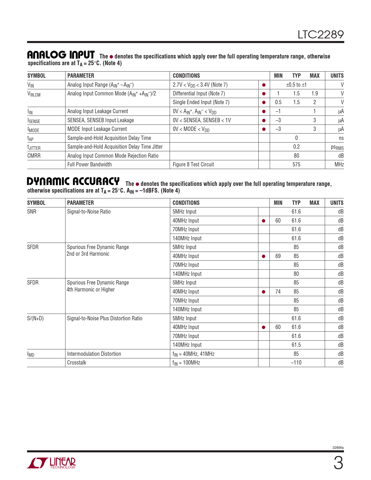 LTC2289 UUA ALOG I PUT The ● denotes the specifications which apply over the full operating temperature range, otherwisespecifications are at TA = 25 ° C. (Note 4)SYMBOLPARAMETERCONDITIONSMINTYPMAXUNITS V + – IN Analog Input Range (AIN –AIN ) 2.7V < VDD < 3.4V (Note 7) ● ±0.5 to ±1 V V + – IN,CM Analog Input Common Mode (AIN +AIN )/2 Differential Input (Note 7) ● 1 1.5 1.9 V Single Ended Input (Note 7) ● 0.5 1.5 2 V I + – IN Analog Input Leakage Current 0V < AIN , AIN < VDD ● –1 1 µA ISENSE SENSEA, SENSEB Input Leakage 0V < SENSEA, SENSEB < 1V ● –3 3 µA IMODE MODE Input Leakage Current 0V < MODE < VDD ● –3 3 µA tAP Sample-and-Hold Acquisition Delay Time 0 ns tJITTER Sample-and-Hold Acquisition Delay Time Jitter 0.2 psRMS CMRR Analog Input Common Mode Rejection Ratio 80 dB Full Power Bandwidth Figure 8 Test Circuit 575 MHz UWDY A IC ACCURACY The ● denotes the specifications which apply over the full operating temperature range,otherwise specifications are at TA = 25 ° C. AIN = –1dBFS. (Note 4)SYMBOLPARAMETERCONDITIONSMINTYPMAXUNITS SNR Signal-to-Noise Ratio 5MHz Input 61.6 dB 40MHz Input ● 60 61.6 dB 70MHz Input 61.6 dB 140MHz Input 61.6 dB SFDR Spurious Free Dynamic Range 5MHz Input 85 dB 2nd or 3rd Harmonic 40MHz Input ● 69 85 dB 70MHz Input 85 dB 140MHz Input 80 dB SFDR Spurious Free Dynamic Range 5MHz Input 85 dB 4th Harmonic or Higher 40MHz Input ● 74 85 dB 70MHz Input 85 dB 140MHz Input 85 dB S/(N+D) Signal-to-Noise Plus Distortion Ratio 5MHz Input 61.6 dB 40MHz Input ● 60 61.6 dB 70MHz Input 61.6 dB 140MHz Input 61.5 dB IMD Intermodulation Distortion fIN = 40MHz, 41MHz 85 dB Crosstalk fIN = 100MHz –110 dB 2289fa 3