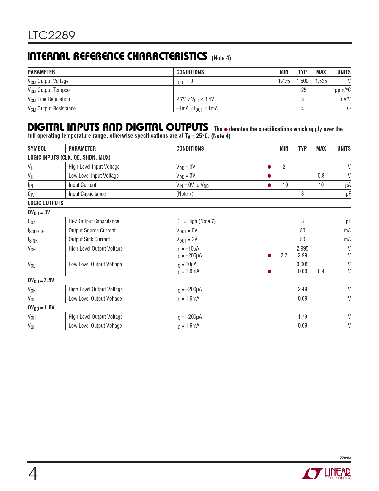VOH High Level Output Voltage IO = –200µA 1.79 V VOL Low Level Output Voltage IO = 1.6mA 0.09 V 2289fa 4