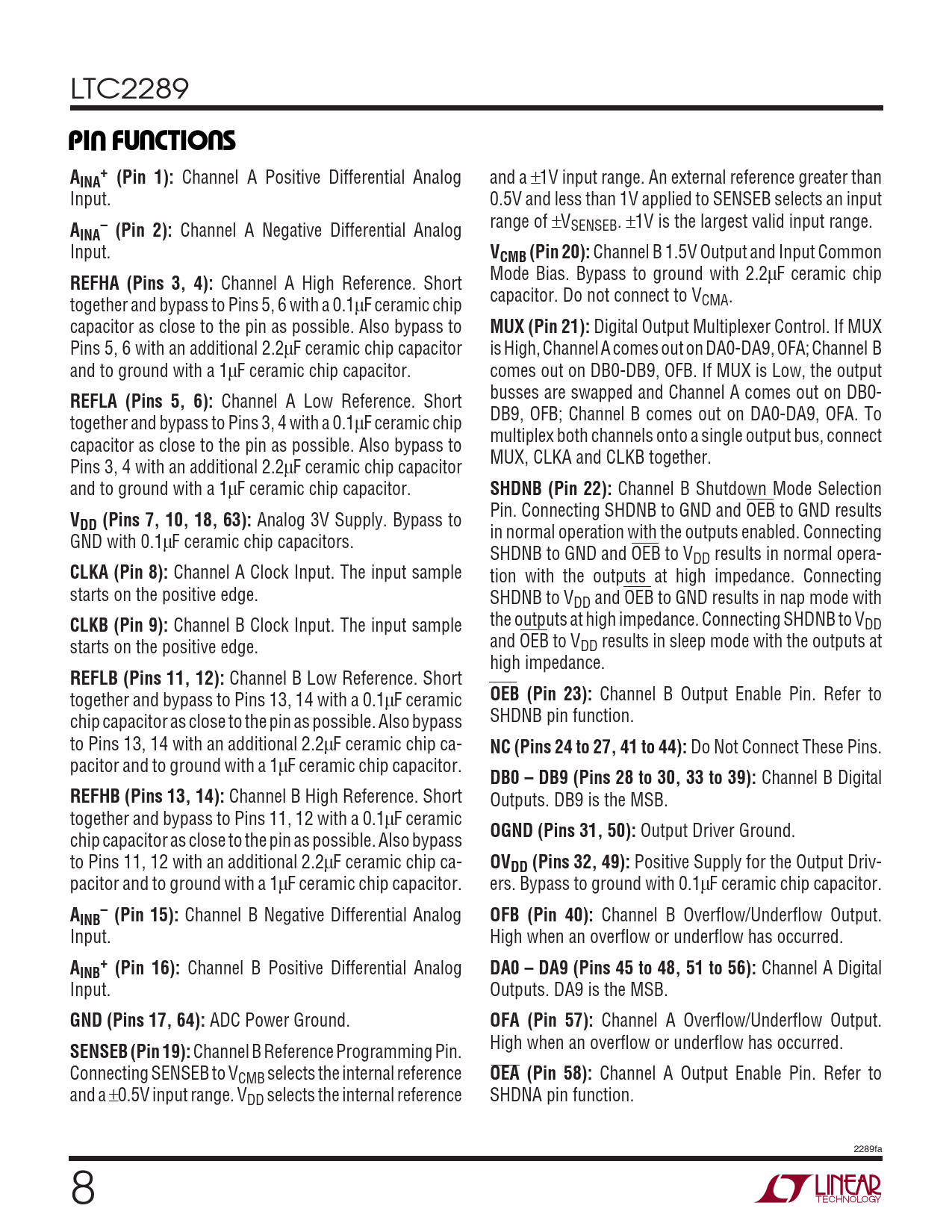 Channel A Output Enable Pin. Refer to and a ±0.5V input range. VDD selects the internal reference SHDNA pin function. 2289fa 8