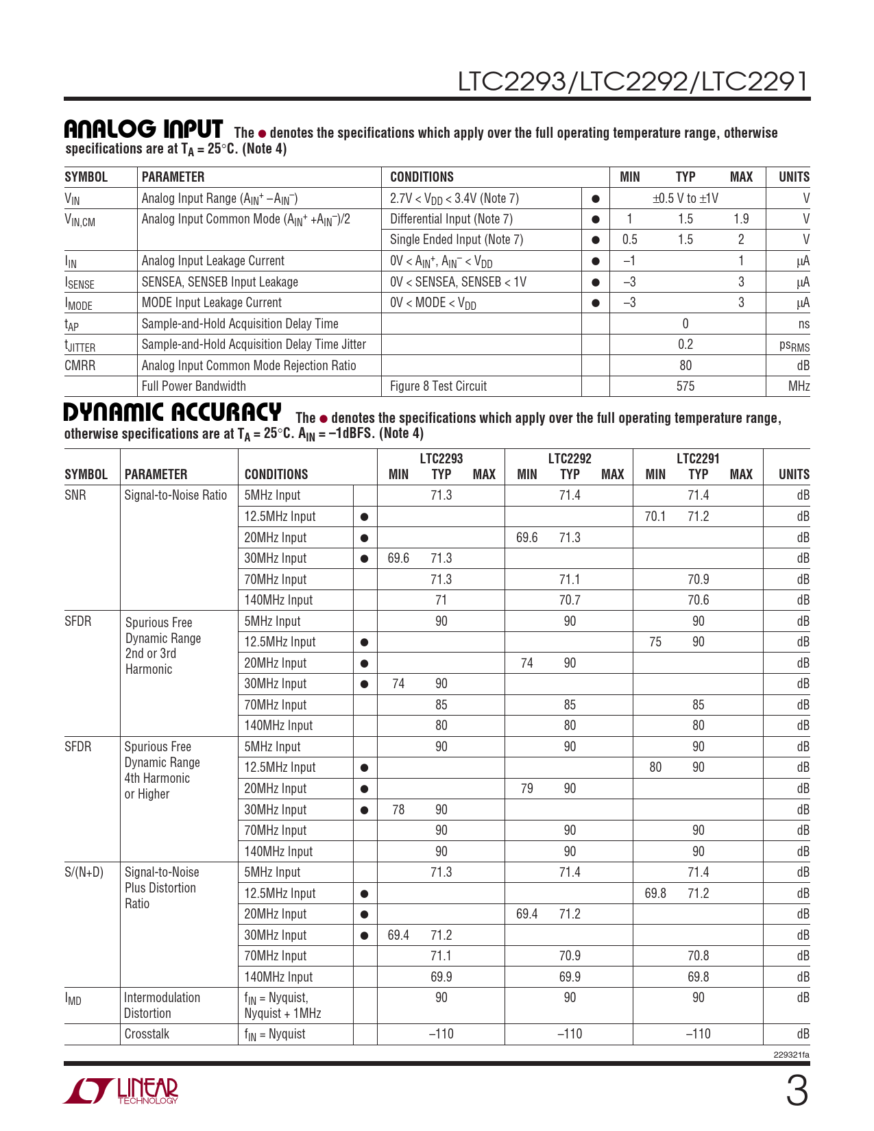 C. AIN = –1dBFS. (Note 4) LTC2293 LTC2292 LTC2291 SYMBOL PARAMETER CONDITIONS MIN TYP MAX MIN TYP MAX MIN TYP MAX UNITS