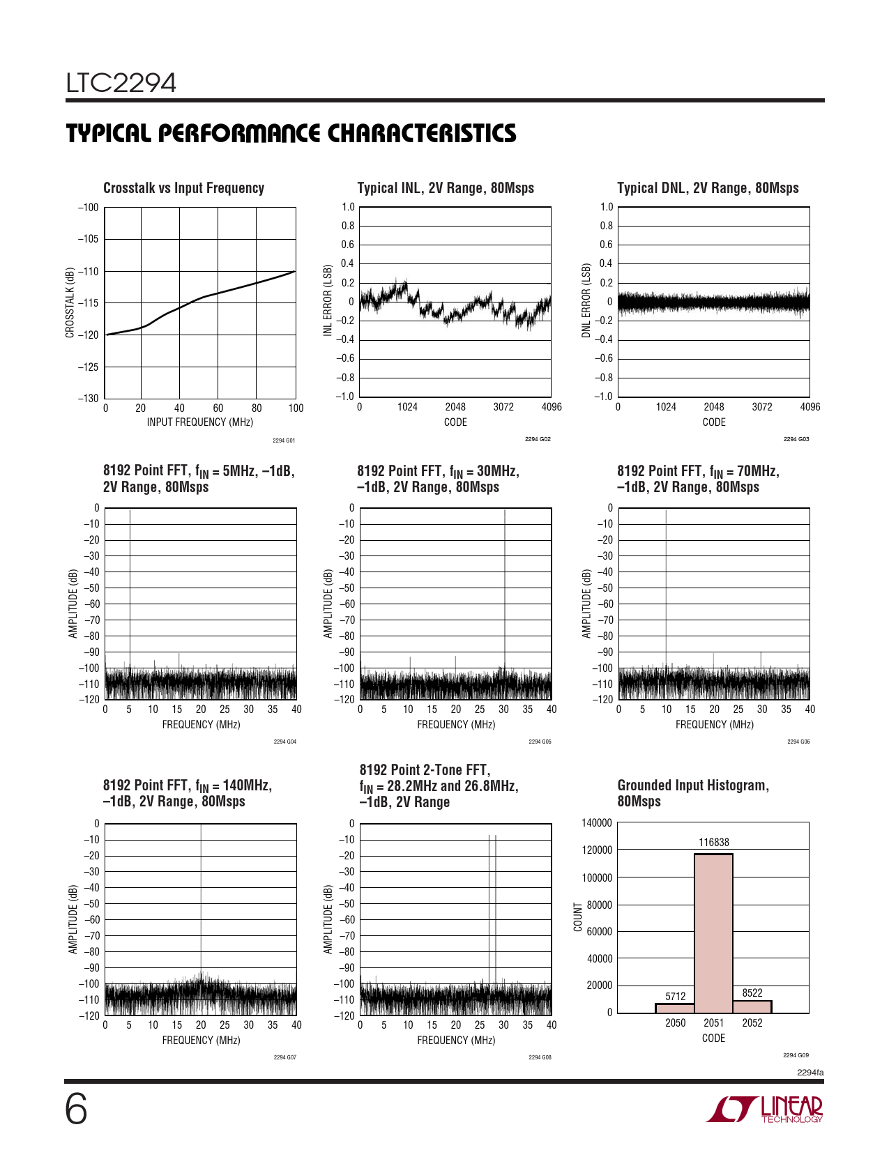 –100 1.0 1.0 0.8 0.8 –105 0.6 0.6 0.4 0.4 –110 0.2 0.2 –115 0 0 –0.2 –0.2 CROSSTALK (dB) –120 INL ERROR (LSB) DNL ERROR (LSB) –0.4 –0.4 –0.6 –0.6 –125 –0.8 –0.8 –130 –1.0 –1.0 0 20 40 60 80 100 0 1024 2048 3072 4096 0 1024 2048 3072 4096 INPUT FREQUENCY (MHz) CODE CODE 2294 G01 2294 G02 2294 G03