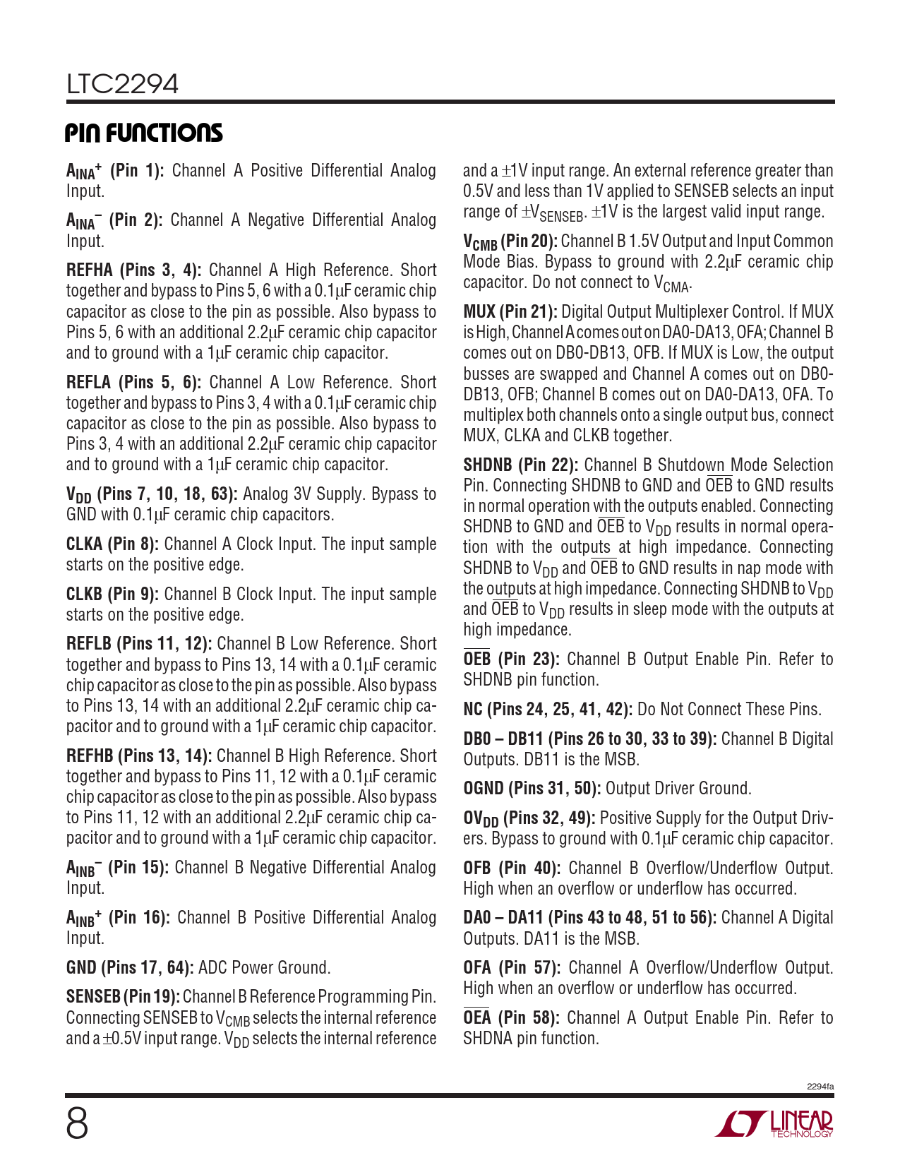Channel A Output Enable Pin. Refer to and a ±0.5V input range. VDD selects the internal reference SHDNA pin function. 2294fa 8