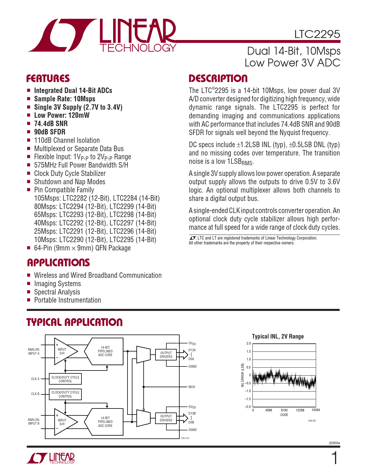 LTC2295 Dual 14-Bit, 10Msps Low Power 3V ADC UFEATURESDESCRIPTIO ■ Integrated Dual 14-Bit ADCs The LTC®2295 is a 14-bit 10Msps, low power dual 3V ■ Sample Rate: 10Msps A/D converter designed for digitizing high frequency, wide ■ Single 3V Supply (2.7V to 3.4V) dynamic range signals. The LTC2295 is perfect for ■ Low Power: 120mW demanding imaging and communications applications ■ 74.4dB SNR with AC performance that includes 74.4dB SNR and 90dB ■ 90dB SFDR SFDR for signals well beyond the Nyquist frequency. ■ 110dB Channel Isolation DC specs include ±1.2LSB INL (typ), ±0.5LSB DNL (typ) ■ Multiplexed or Separate Data Bus and no missing codes over temperature. The transition ■ Flexible Input: 1VP-P to 2VP-P Range noise is a low 1LSB ■ 575MHz Full Power Bandwidth S/H RMS. ■ Clock Duty Cycle Stabilizer A single 3V supply allows low power operation. A separate ■ Shutdown and Nap Modes output supply allows the outputs to drive 0.5V to 3.6V ■ Pin Compatible Family logic. An optional multiplexer allows both channels to 105Msps: LTC2282 (12-Bit), LTC2284 (14-Bit) share a digital output bus. 80Msps: LTC2294 (12-Bit), LTC2299 (14-Bit) A single-ended CLK input controls converter operation. An 65Msps: LTC2293 (12-Bit), LTC2298 (14-Bit) optional clock duty cycle stabilizer allows high perfor- 40Msps: LTC2292 (12-Bit), LTC2297 (14-Bit) mance at full speed for a wide range of clock duty cycles. 25Msps: LTC2291 (12-Bit), LTC2296 (14-Bit) , LTC and LT are registered trademarks of Linear Technology Corporation. 10Msps: LTC2290 (12-Bit), LTC2295 (14-Bit) All other trademarks are the property of their respective owners. ■ 64-Pin (9mm × 9mm) QFN Package UAPPLICATIO S ■ Wireless and Wired Broadband Communication ■ Imaging Systems ■ Spectral Analysis ■ Portable Instrumentation UTYPICAL APPLICATIOTypical INL, 2V Range OVDD 2.0 + 14-BIT ANALOG INPUT PIPELINED D13A 1.5 INPUT A S/H OUTPUT • ADC CORE • – DRIVERS • D0A 1.0 OGND 0.5 0 CLK A CLOCK/DUTY CYCLE CONTROL –0.5 INL ERROR (LSB) MUX –1.0 CLK B CLOCK/DUTY CYCLE CONTROL –1.5 OVDD –2.0 0 4096 8192 12288 16384 D13B + CODE OUTPUT • 14-BIT • ANALOG • INPUT DRIVERS 2295 G02 PIPELINED INPUT B D0B S/H ADC CORE – OGND 2295 TA01 2295fa 1