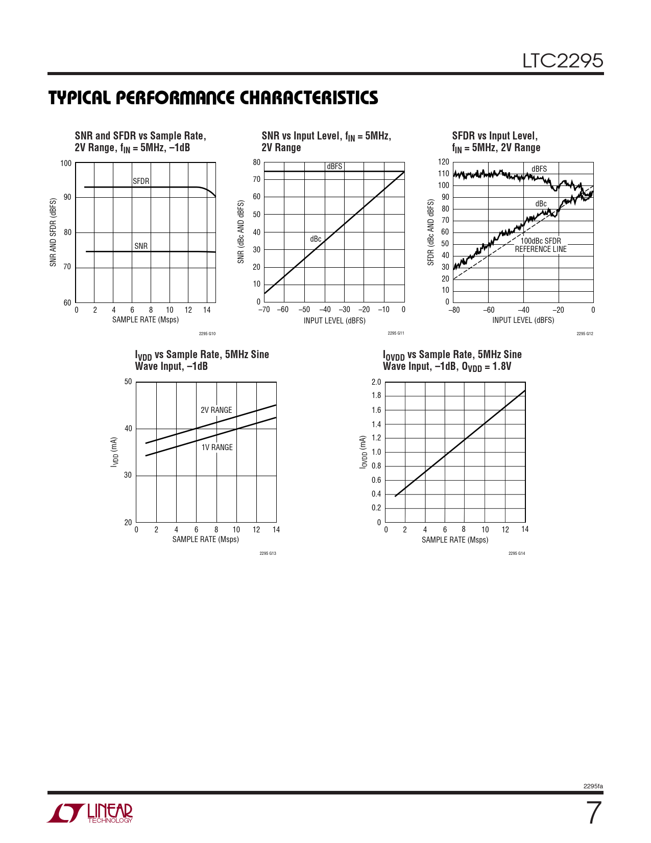 100 80 120 dBFS dBFS 110 SFDR 70 100 90 60 90 dBc 80 50 70 80 40 60 dBc 100dBc SFDR SNR 50 30 REFERENCE LINE 40 SNR AND SFDR (dBFS) SNR (dBc AND dBFS) 70 SFDR (dBc AND dBFS) 20 30 20 10 10 60 0 0 0 2 4 6 8 10 12 14 –70 –60 –50 –40 –30 –20 –10 0 –80 –60 –40 –20 0 SAMPLE RATE (Msps) INPUT LEVEL (dBFS) INPUT LEVEL (dBFS) 2295 G10 2295 G11 2295 G12