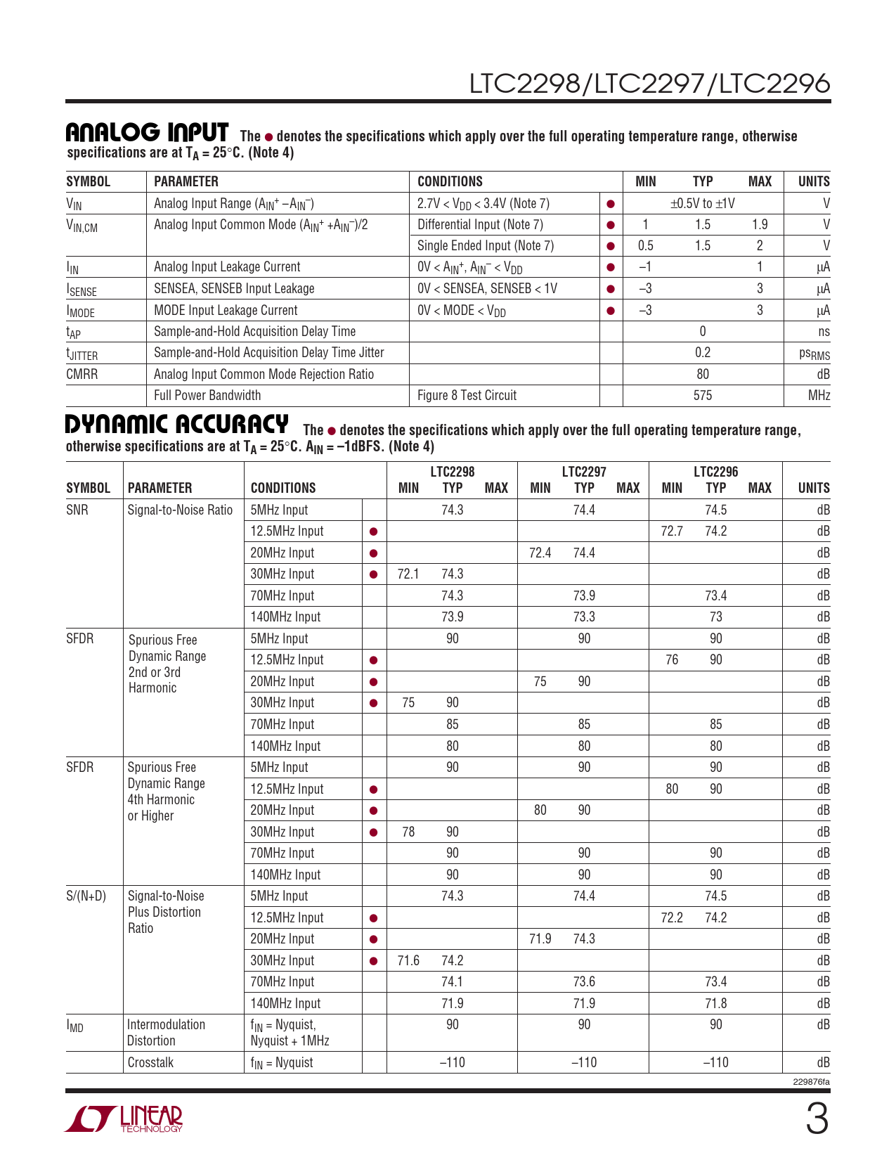LTC2298/LTC2297/LTC2296 UUA ALOG I PUT The ● denotes the specifications which apply over the full operating temperature range, otherwisespecifications are at TA = 25 ° C. (Note 4)SYMBOLPARAMETERCONDITIONSMINTYPMAXUNITS V + – IN Analog Input Range (AIN –AIN ) 2.7V < VDD < 3.4V (Note 7) ● ±0.5V to ±1V V V + – IN,CM Analog Input Common Mode (AIN +AIN )/2 Differential Input (Note 7) ● 1 1.5 1.9 V Single Ended Input (Note 7) ● 0.5 1.5 2 V I + – IN Analog Input Leakage Current 0V < AIN , AIN < VDD ● –1 1 µA ISENSE SENSEA, SENSEB Input Leakage 0V < SENSEA, SENSEB < 1V ● –3 3 µA IMODE MODE Input Leakage Current 0V < MODE < VDD ● –3 3 µA tAP Sample-and-Hold Acquisition Delay Time 0 ns tJITTER Sample-and-Hold Acquisition Delay Time Jitter 0.2 psRMS CMRR Analog Input Common Mode Rejection Ratio 80 dB Full Power Bandwidth Figure 8 Test Circuit 575 MHz UWDY A IC ACCURACY The ● denotes the specifications which apply over the full operating temperature range,otherwise specifications are at TA = 25 ° C. AIN = –1dBFS. (Note 4)LTC2298LTC2297LTC2296SYMBOLPARAMETERCONDITIONSMINTYPMAXMINTYPMAXMINTYPMAXUNITS SNR Signal-to-Noise Ratio 5MHz Input 74.3 74.4 74.5 dB 12.5MHz Input ● 72.7 74.2 dB 20MHz Input ● 72.4 74.4 dB 30MHz Input ● 72.1 74.3 dB 70MHz Input 74.3 73.9 73.4 dB 140MHz Input 73.9 73.3 73 dB SFDR Spurious Free 5MHz Input 90 90 90 dB Dynamic Range 12.5MHz Input ● 76 90 dB 2nd or 3rd 20MHz Input ● 75 90 dB Harmonic 30MHz Input ● 75 90 dB 70MHz Input 85 85 85 dB 140MHz Input 80 80 80 dB SFDR Spurious Free 5MHz Input 90 90 90 dB Dynamic Range 12.5MHz Input ● 80 90 dB 4th Harmonic 20MHz Input ● 80 90 dB or Higher 30MHz Input ● 78 90 dB 70MHz Input 90 90 90 dB 140MHz Input 90 90 90 dB S/(N+D) Signal-to-Noise 5MHz Input 74.3 74.4 74.5 dB Plus Distortion 12.5MHz Input ● 72.2 74.2 dB Ratio 20MHz Input ● 71.9 74.3 dB 30MHz Input ● 71.6 74.2 dB 70MHz Input 74.1 73.6 73.4 dB 140MHz Input 71.9 71.9 71.8 dB IMD Intermodulation fIN = Nyquist, 90 90 90 dB Distortion Nyquist + 1MHz Crosstalk fIN = Nyquist –110 –110 –110 dB 229876fa 3