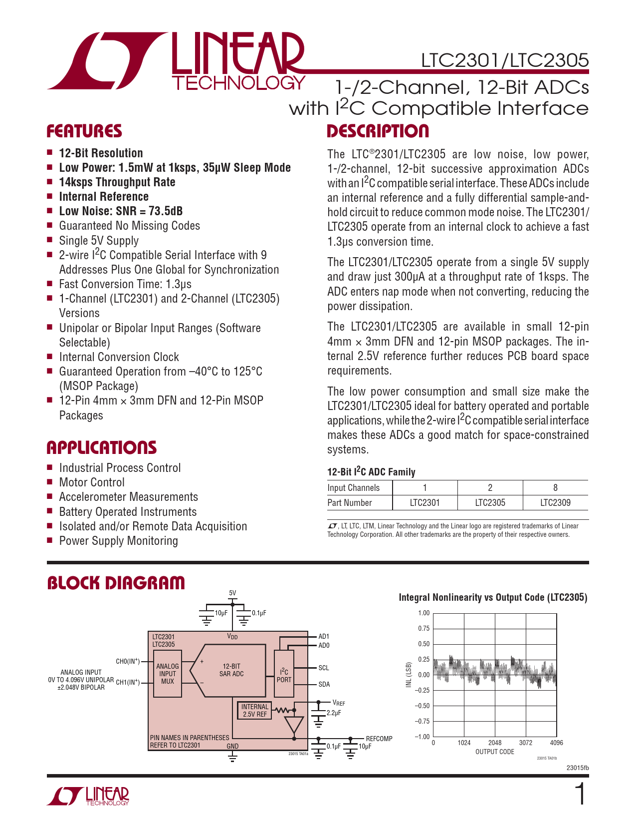 LTC2301/LTC2305 1-/2-Channel, 12-Bit ADCs with I2C Compatible Interface FEATURESDESCRIPTION n 12-Bit Resolution The LTC®2301/LTC2305 are low noise, low power, n Low Power: 1.5mW at 1ksps, 35μW Sleep Mode 1-/2-channel, 12-bit successive approximation ADCs n 14ksps Throughput Rate with an I2C compatible serial interface. These ADCs include n Internal Reference an internal reference and a fully differential sample-and- n Low Noise: SNR = 73.5dB hold circuit to reduce common mode noise. The LTC2301/ n Guaranteed No Missing Codes LTC2305 operate from an internal clock to achieve a fast n Single 5V Supply 1.3μs conversion time. n 2-wire I2C Compatible Serial Interface with 9 The LTC2301/LTC2305 operate from a single 5V supply Addresses Plus One Global for Synchronization and draw just 300μA at a throughput rate of 1ksps. The n Fast Conversion Time: 1.3μs ADC enters nap mode when not converting, reducing the n 1-Channel (LTC2301) and 2-Channel (LTC2305) power dissipation. Versions n Unipolar or Bipolar Input Ranges (Software The LTC2301/LTC2305 are available in small 12-pin Selectable) 4mm × 3mm DFN and 12-pin MSOP packages. The in- n Internal Conversion Clock ternal 2.5V reference further reduces PCB board space n Guaranteed Operation from –40°C to 125°C requirements. (MSOP Package) The low power consumption and small size make the n 12-Pin 4mm × 3mm DFN and 12-Pin MSOP LTC2301/LTC2305 ideal for battery operated and portable Packages applications, while the 2-wire I2C compatible serial interface makes these ADCs a good match for space-constrained APPLICATIONS systems. n Industrial Process Control 12-Bit I2C ADC Family n Motor Control Input Channels 1 2 8 n Accelerometer Measurements Part Number LTC2301 LTC2305 LTC2309 n Battery Operated Instruments n Isolated and/or Remote Data Acquisition L, LT, LTC, LTM, Linear Technology and the Linear logo are registered trademarks of Linear Technology Corporation. All other trademarks are the property of their respective owners. n Power Supply Monitoring BLOCK DIAGRAM 5V Integral Nonlinearity vs Output Code (LTC2305) 10μF 0.1μF 1.00 0.75 LTC2301 VDD AD1 LTC2305 AD0 0.50 CH0(IN+) + 0.25 ANALOG 12-BIT SCL ANALOG INPUT INPUT SAR ADC I2C 0.00 0V TO 4.096V UNIPOLAR CH1(IN+) MUX – PORT ±2.048V BIPOLAR SDA INL (LSB) –0.25 VREF INTERNAL –0.50 2.5V REF 2.2μF –0.75 PIN NAMES IN PARENTHESES REFCOMP –1.00 REFER TO LTC2301 0 1024 2048 3072 4096 GND 0.1μF 10μF 23015 TA01a OUTPUT CODE 23015 TA01b 23015fb 1