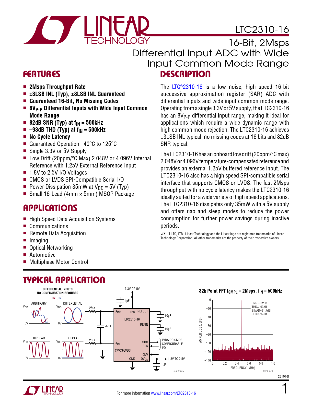 Description16-Bit, 2Msps Differential Input ADC with Wide Input Common Mode Range